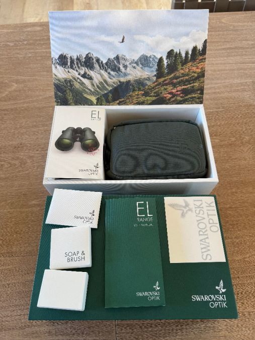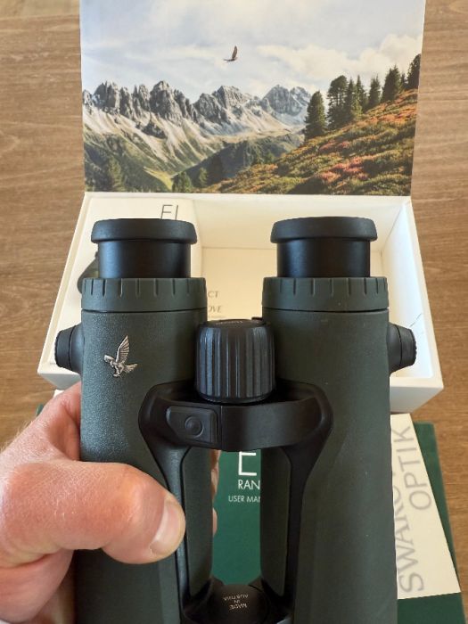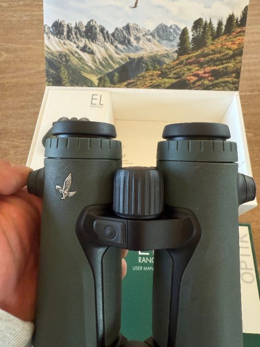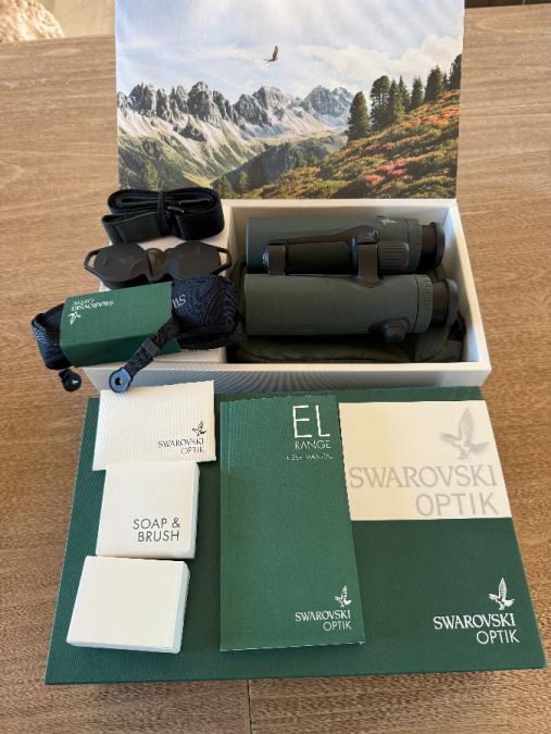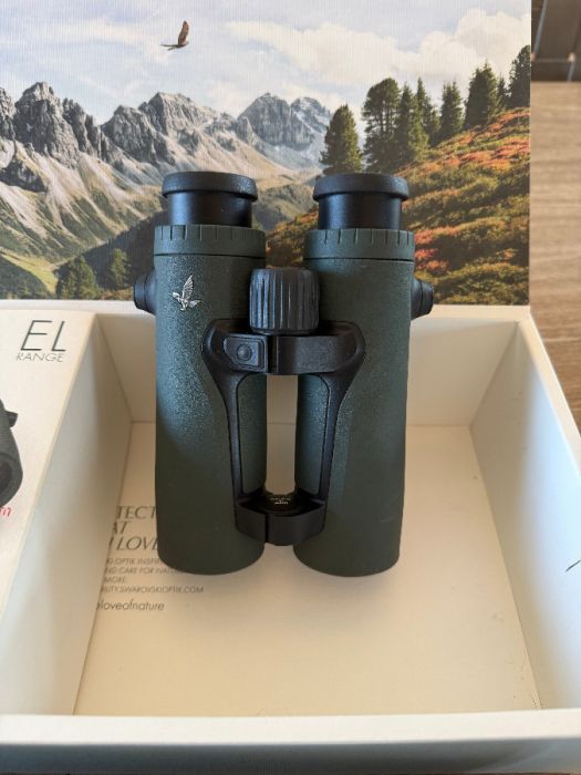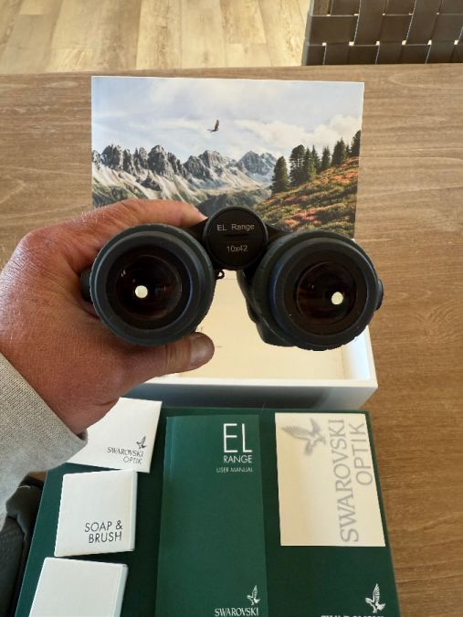 Swarovski EL Range 10x42 binoculars with tracking assist which gives coordinates of the last point that was ranged. I got these as a gift last year and used them on one hunt. Great glass. What I didn't like was the fact that you have to use a Swarovski scope on your rifle in order for the ballistics to seamlessly calculate. Since I don't own any Swarovski rifle scopes these were basically just a range finder. A really nice range finder. My loss is your gain. No trades.