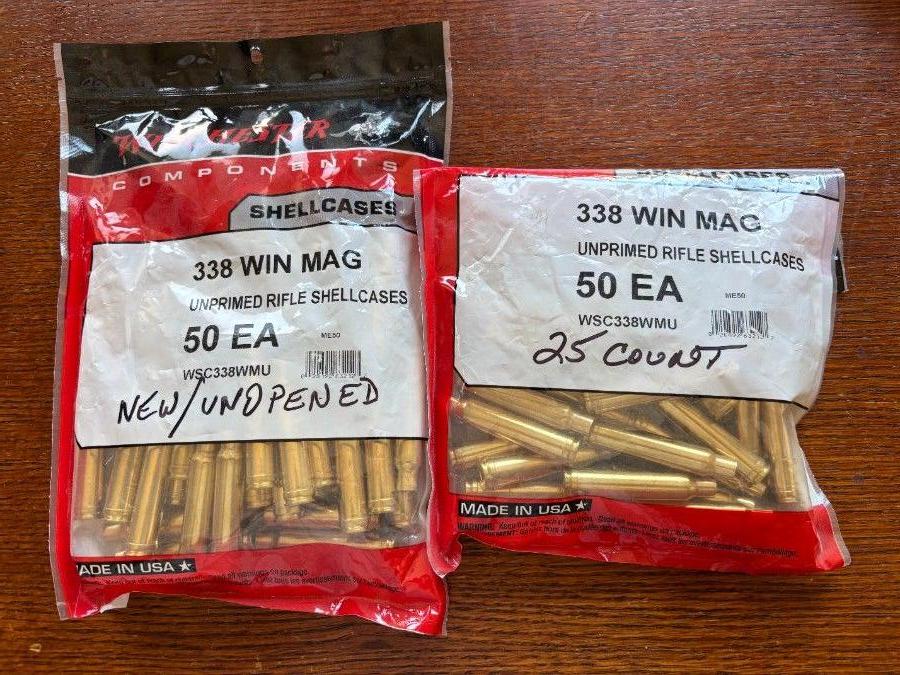 For sale are 75 pieces of brand new unfired 338 Winchester Magnum brass, I have 1 unopened bag of 50 and 1 opened bag of 25. This stuff is hard to find and usually way over priced. Buy mine for $80. Cash and in person only. Call or text (preferred) Dave at 208-725-9003