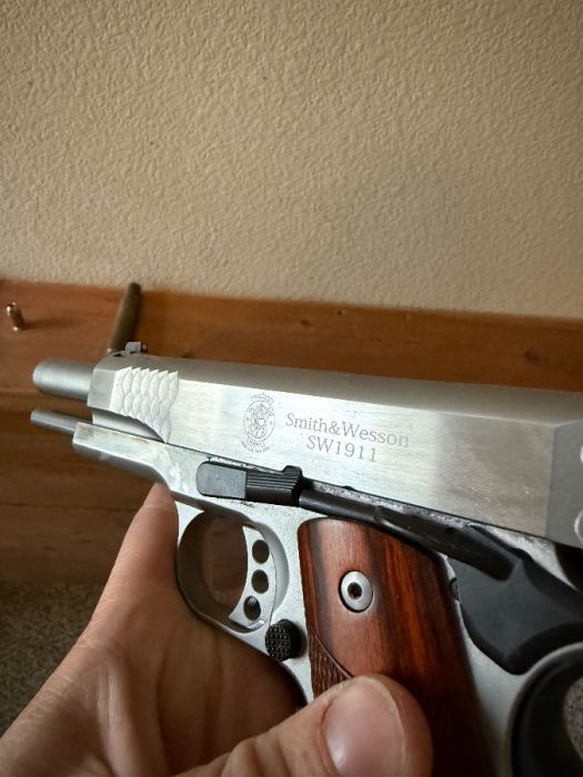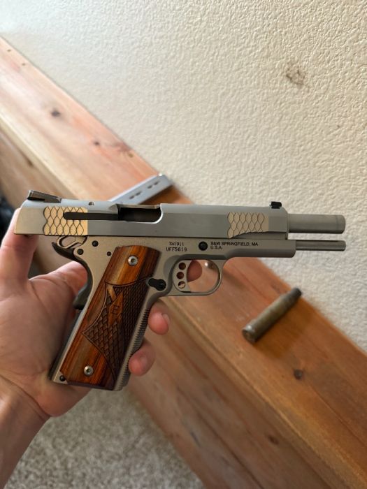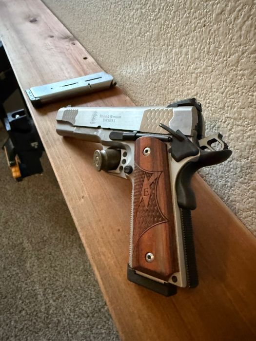 45 ACP. S&W 1911 E Series. Great condition shoot straight great side arm for bears while hunting/ hiking Comes with extra mag 1000 cash only obo