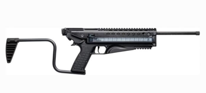 KELTEC R50 stands for Rifle - 50 Rounds in complementing contrast to the P50, the pistol version of the same platform. This carbine features a side-folding stock that rests nicely on either side of the grip when folded and a ½ x 28 threaded - 16 inch barrel. It does come with some utility sights that are adjustable for windage and elevation, however the R50 receiver offers over 7 inches of picatinny rail space up top for mounting just about any optic or accessory you like. 2 inches of rail space on the bottom is ideal for light and grip options. There’s a QD sling cup just above the magazine release for mounting a single point sling and the AR style charging handle offers smooth manipulation.