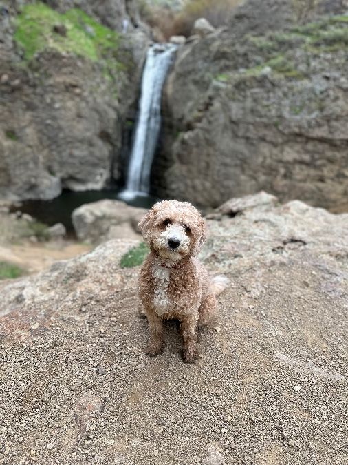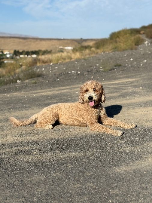 Meet Lulu! She is a three year old Goldendoodle with light red and white tuxedo markings. She weighs 23 pounds and stands 15” to her shoulder. Lulu is a smart girl. She is potty trained, crate trained, and does great on a leash. She is a wonderful running buddy with high energy! She knows commands such as sit, lay down, roll over, and stay. Lulu is up to date on all vaccines and deworming, and she is spayed. She does not shed, but will need routine brushing and grooming. Unfortunately, Lulu does not do too well with chickens. Other than that she is wonderful!