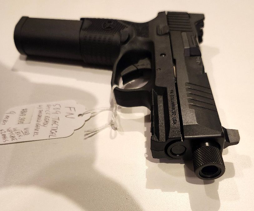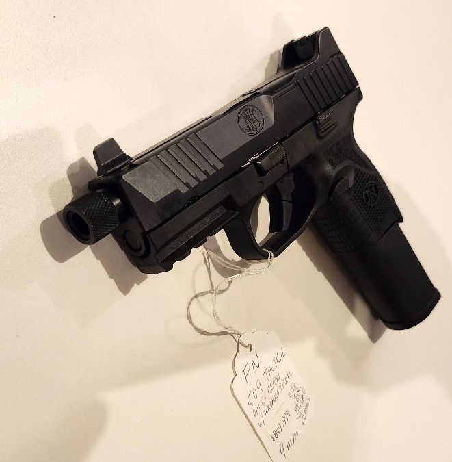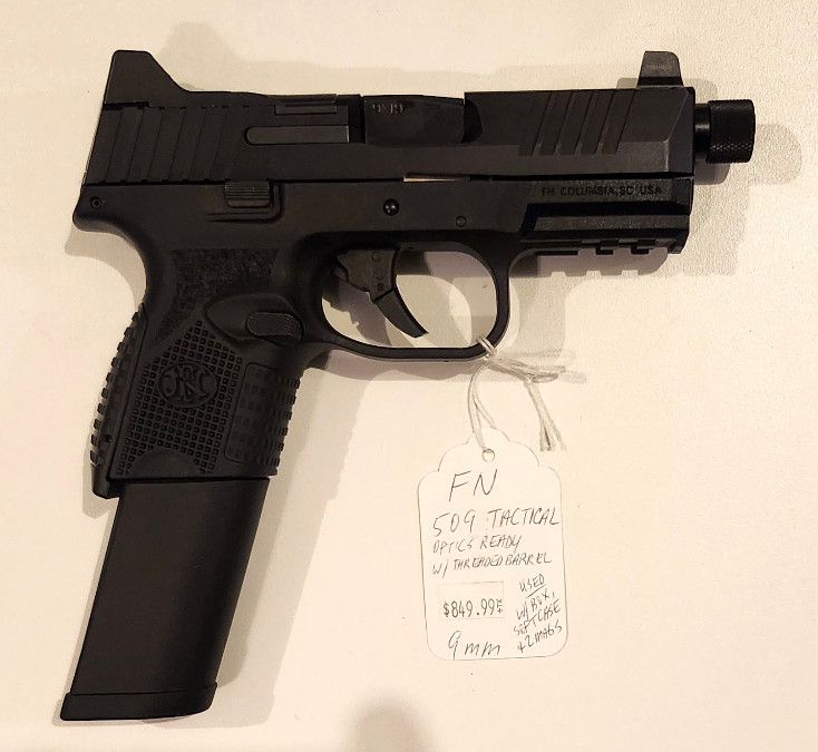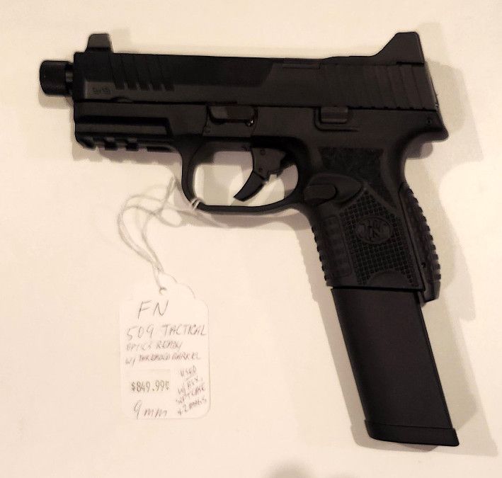 FN 509 Tactical 9mm pistol with threaded barrel, suppressor height sites, two total mags (1 qty: 24 round extended mag pictured and one standard mag). Comes with original box. In Excellent used condition. Sale Price: $769.99 ptx FFL by appointment only. Serious inquiries only. Call 208-286-7300 or email me at patriotpawnidaho@gmail.com.