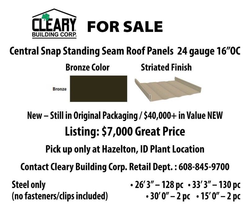 New never been used standing seam steel. 24 gauge. 16" OC. Still in original packing crates. 130 at 33' 128 at 26' 2 at 30' and 2 at 15'. Color Bronze. Just steel, no clips. $40,000.00 Value for only $5,000.00. Pick up at the Hazelton Plant of Cleary Building.