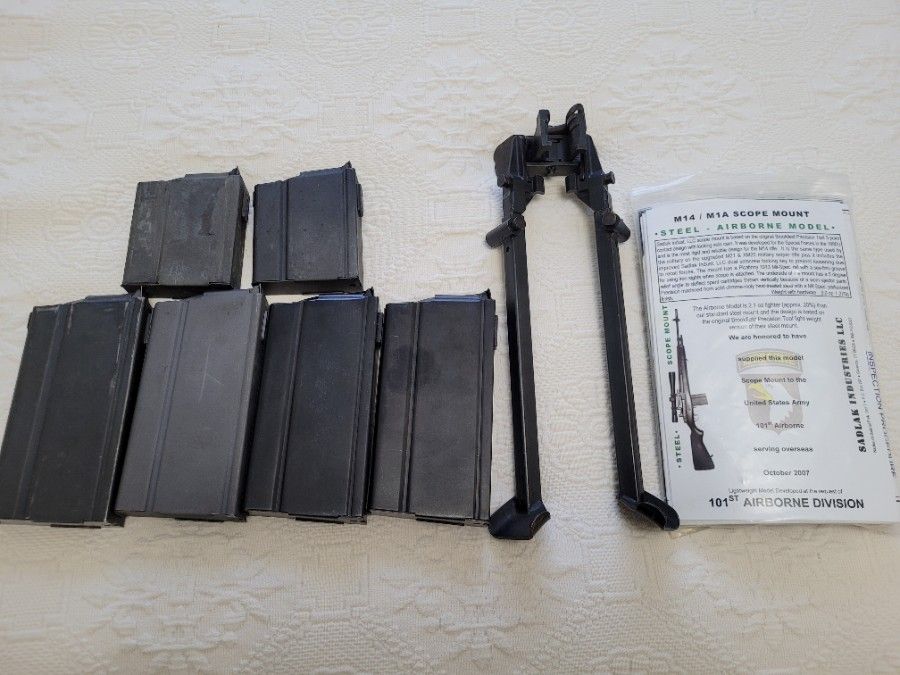 (6) Springfield magazines, (1) Springfield bipod, and (1) Sadlak scope mount for M1A. all like new.