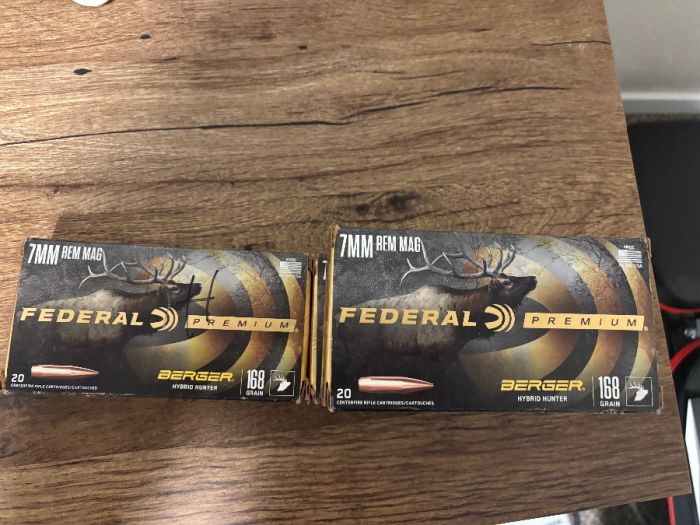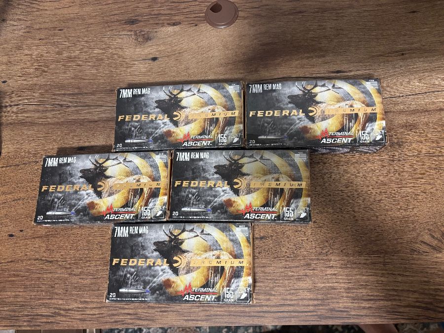 7mm rem mag Federal Terminal Ascent 155 gr. 6 1/2 boxes available $45 each. 7mm rem mag Federal Premium Berger 168 gr. 4 1/2 boxes available. $40 each