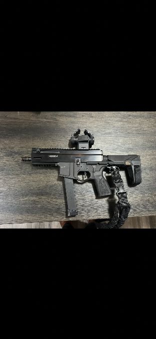 This is a matador arms ar 9 upper. Vortex red dot and maxim telescopic brace. Super fun to shoot especially suppressed. Has 100 rounds through it. Asking 1000 obo call or text Mike at 208-890-2018