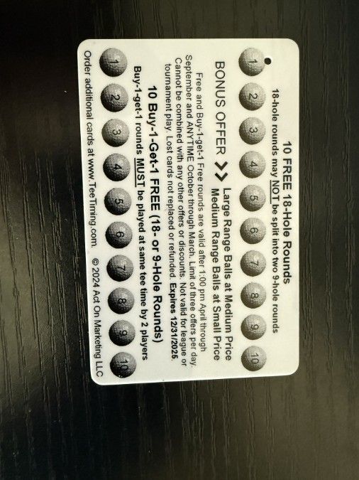 2025 VIP card for Boise Ranch, only used 1 free punch on the card so remaining are 9 free rounds plus 10 bogo rounds left on the card. I tweaked my knee and will not be able to use the card this fall. Paid $249, will sell for $150. 208-830-4083, calls only-no texts