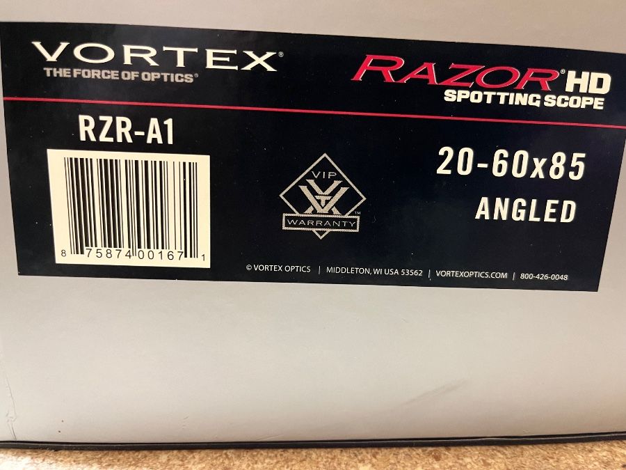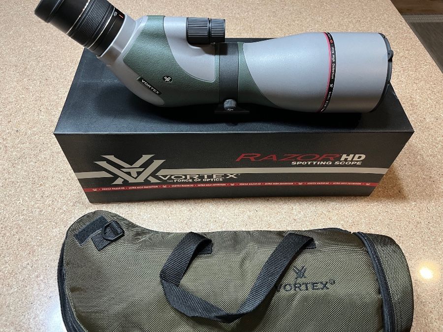 Up for sale is a top of the line Vortex Razor HD spotting scope. The magnification range on this spotter is 20x to 60x. The 85mm objective lens lets in tons of light making this the ideal setup for early morning and late afternoon/evening spotting. The articulating foot on the scope allows it to be used in a variety of positions for ease of use. The HD lenses result in a clear, crisp image from edge to edge with virtually no color fringing or chromatic aberration. The scope is in like new condition. It's been used very little and has always been stored in a climate controlled safe. Included with the spotting scope is a stay on case. The spotter can be used with the case attached for an added level of protection while in use. Local cash sales only.