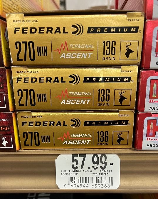 4 boxes of the federal terminal ascent 136 grain ammunition. Great hunting round. First 160.00 gets all 4 boxes. Open to trades but prefer cash. Shoot me a text or call 208-841-3745 thanks for loooking.