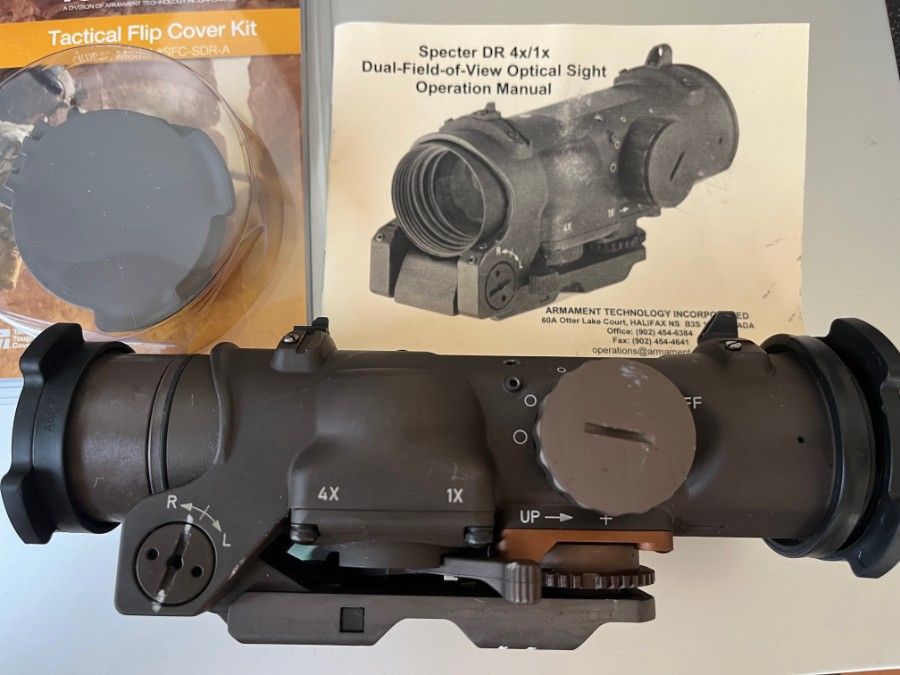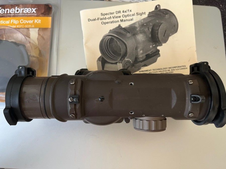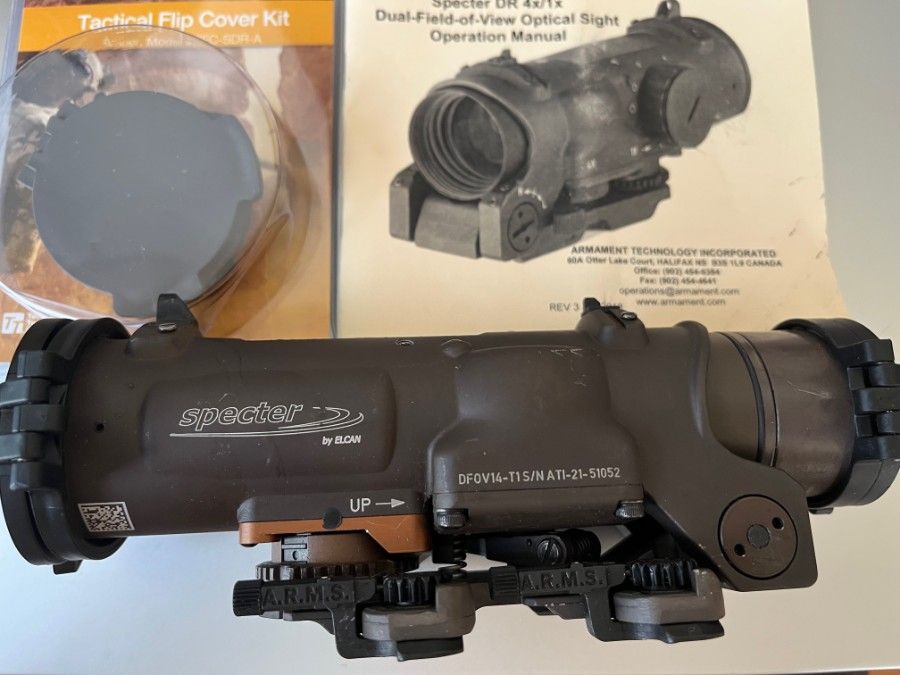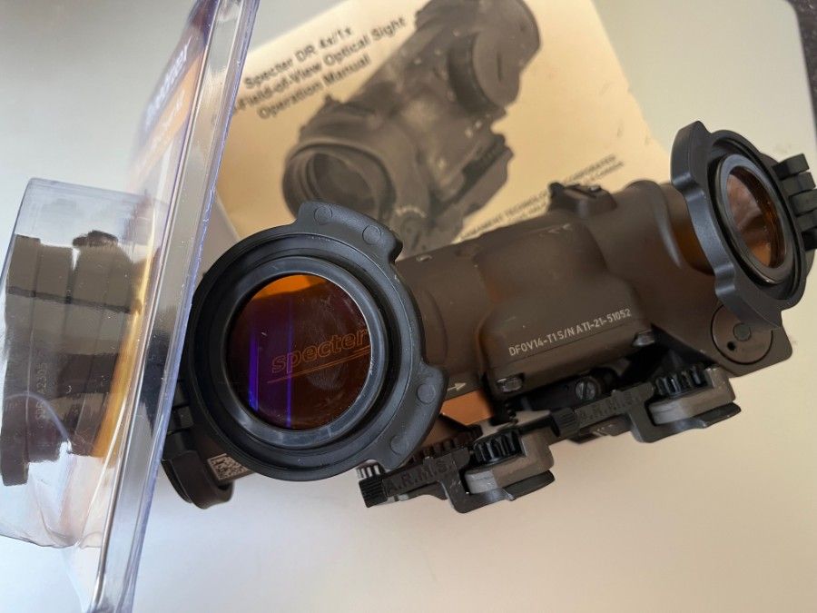 Elcan FDE 1-4 5.56 with upgraded ARMS levers, includes both the solid flip caps, as well as amber see through flip caps. also includes manual, but no box. threw out the ARD insert that attaches to the front cap, as it makes 1x unusable. lightly used, glass is 100%, as is the illumination Not looking for trades, but would be open to a Glock 19 COA, or Romeo 8T AMR set towards the purchase