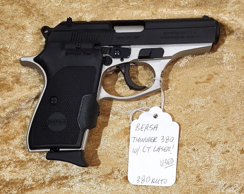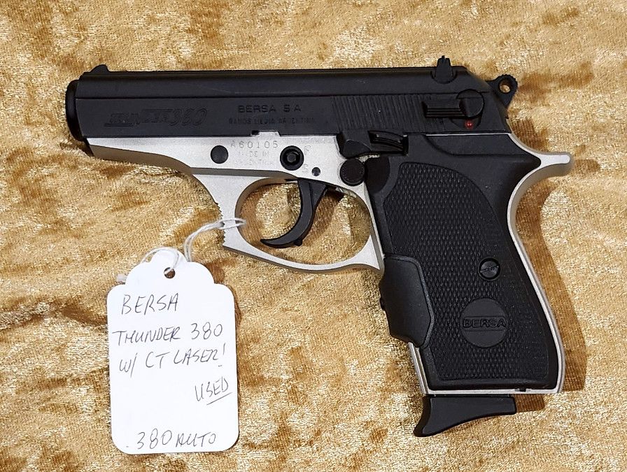 Bersa Thunder 380 duotone .380 auto caliber pistol w/ Crimson Trace Laser Grips. In Excellent used condition. Sale price: $329.99 plus tax. FFL by appointment only. Serious inquiries only. Call 208-286-7300 or email me at patriotpawnidaho@gmail.com.
