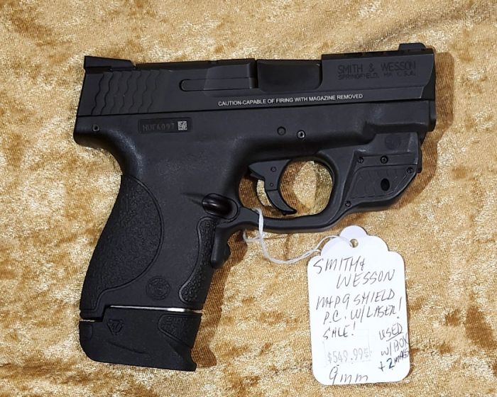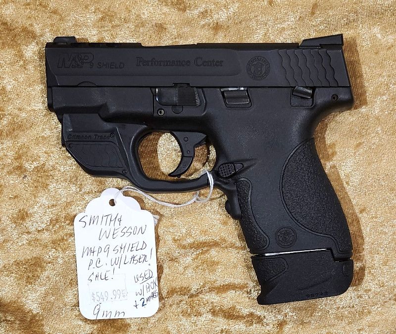 Smith & Wesson Performance Center M&P 9 Shield 9mm semi-auto pistol with Green Crimson Trace Laser. Comes with box & 2 mags. In Excellent used condition. This has a Ported Barrel for less recoil and Night Sights. Sale price: $529.99 plus tax. FFL by appointment only. Serious inquiries only. Call 208-286-7300 or email me at patriotpawnidaho@gmail.com.
