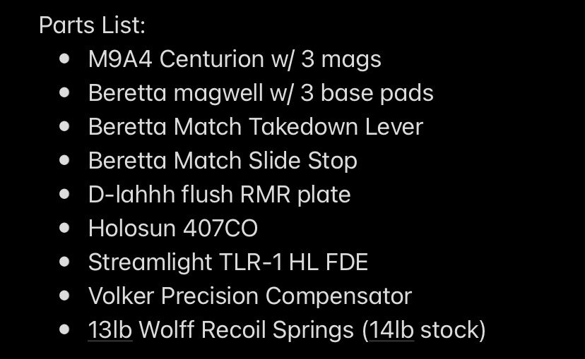 Parts list in photos and includes all stock parts. This has been my go-to pistol. It has been tested & 100% reliable with 90, 115, and 124 grain 9mm and is an absolute rocket to shoot. Only selling because I am pivoting to USPSA and want a setup that is better for that. Some wear from holster & mag change practice, but overall a clean setup. Text is best. Must show Idaho ID. Pretty firm on price, no trades unless you have a 92G Elite Centurion. Also have a competition holster I could include if interested.