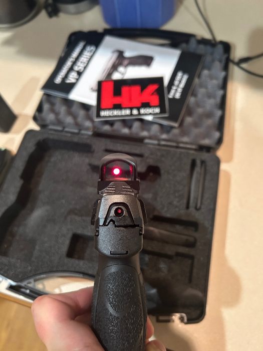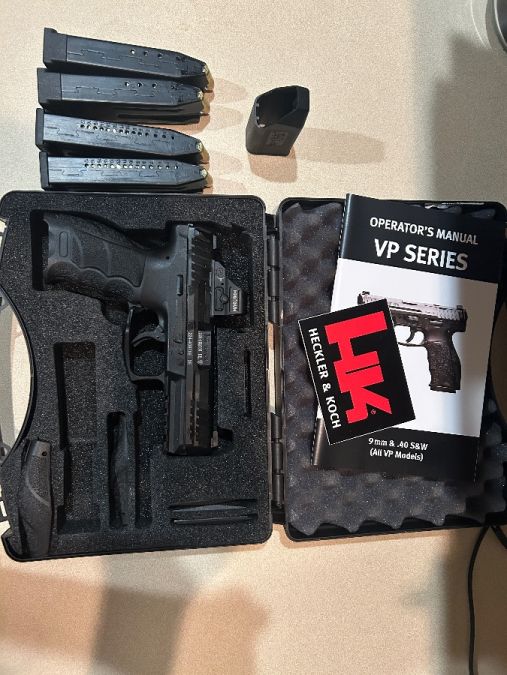 Great condition vp9 with a 407c x2 red dot 2 moa and two 17 round mags and 2 10 rounders. Comes with baldr s 800 lumen flashlight/blue laser, carry case, interchangeable back straps and side straps, mag loader, please text for communication thanks