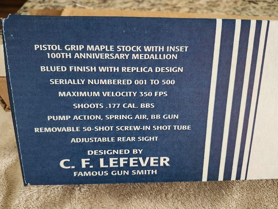 #337 of 500 produced. Gun was purchased directly from Daisy Air Gun Museum in Roger's Arkansas. This Gun has NEVER been fired or cocked. I did lightly oil the Gun when received. Rifle is in mint condition, but there is a small nick on the back of the box. All paperwork comes with the gun. $250.00