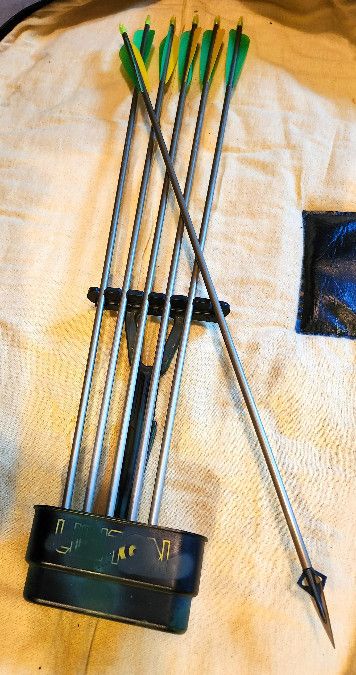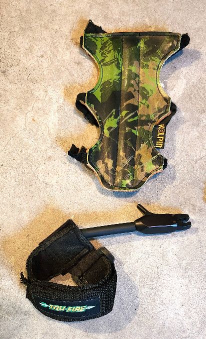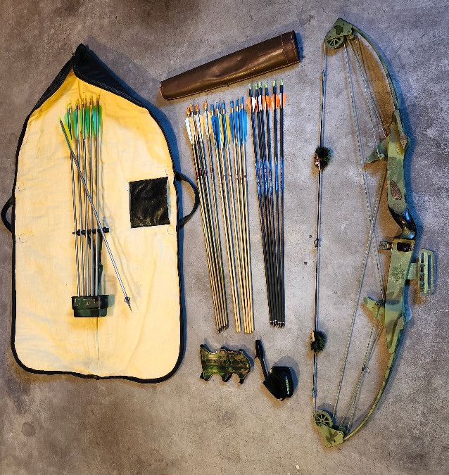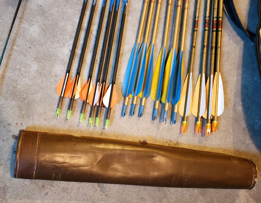 Starter Bow / Fishing Bow lot with tons of arrows & accessories / archery package. Everything you see pictured is included. Bow, soft case, all the arrows, Tru-Fire release, Kolpin arm guard and faux leather arrow quiver. Arrow shafts are 30 inches long. Price Drop: $40.00 Call me at 208-286-7300. Can do a public meetup. Leave a message if I don't answer and I'll get back to you promptly.