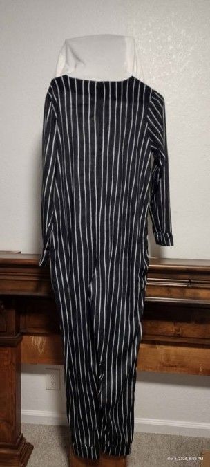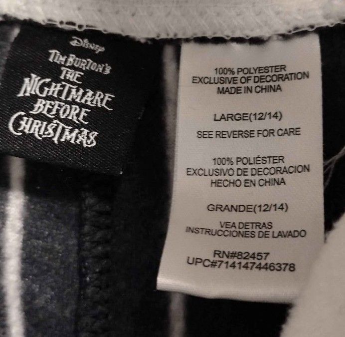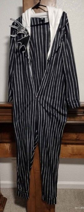 Jack Skellington Nightmare Before Christmas Union Suit SZ LG 12/14 If you're looking for a super cozy costume this year, or a gift for the movie fan in your life, this Jack Skellington Nightmare Before Christmas Union Suit is the perfect choice! Features: 100% polyester Fleece union suit has zipper down center front, embroidered details Hood has fiber filled eyes and nose Rib knit wrist and ankle cuffs Side seam pockets on each hip Officially licensed Includes the following: Hooded Union Suit
