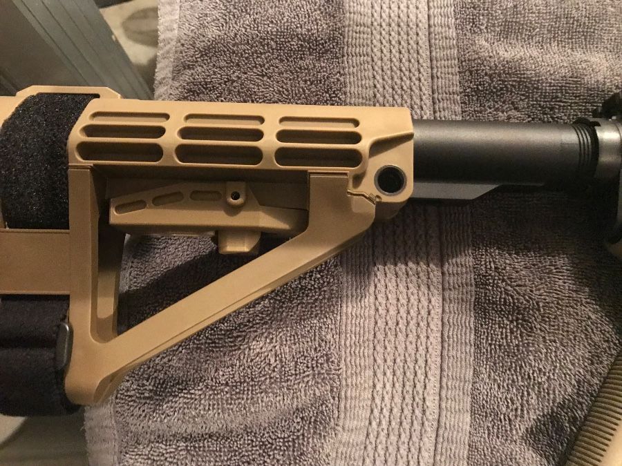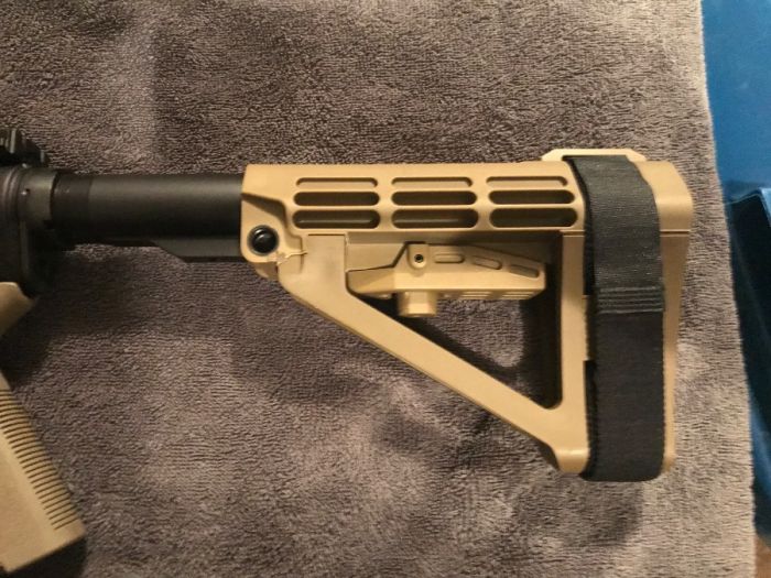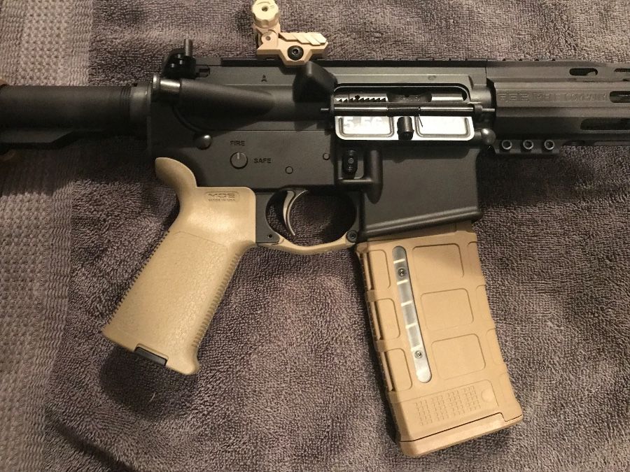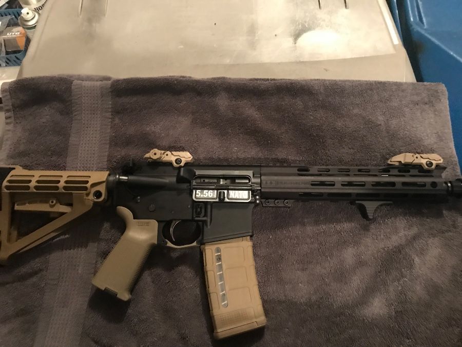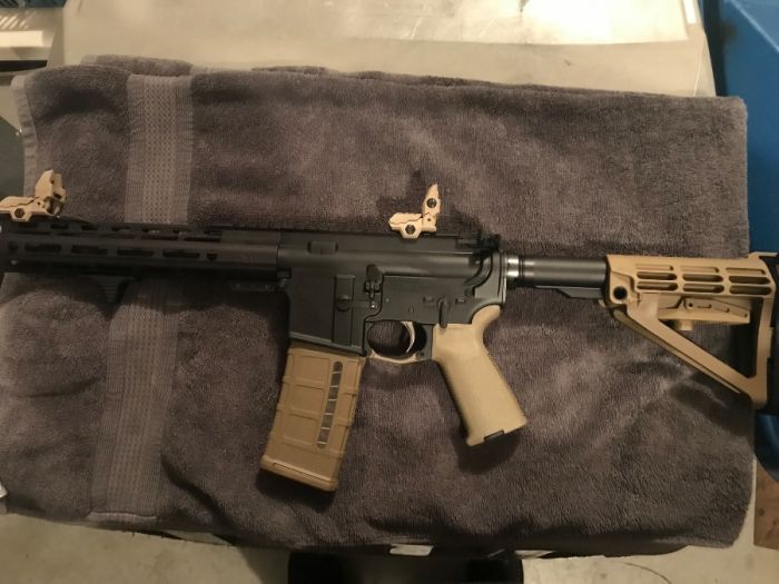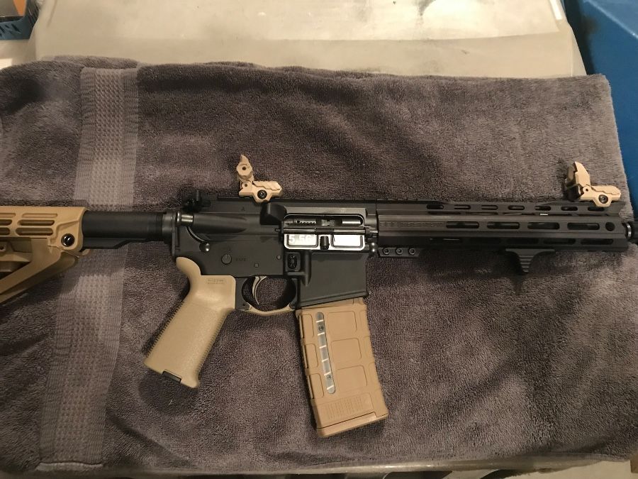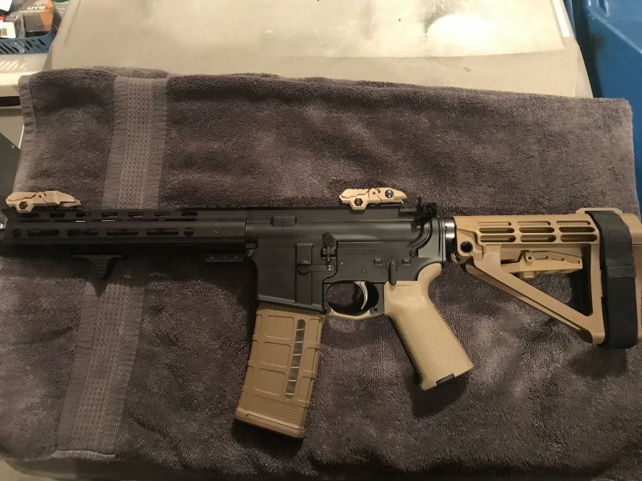AR Pistol. 10” Barrel. Chambered in 5.56/.223. ABC Upper with PSA Lower. SBA4 Adjustable Grip. MOE Grip. Enhanced Polished Trigger. Flip-Up Sights. Custom Flash Can and Hand Stop. Never Fired. Comes with One 30-Round Window Magazine. Cash Only, NoTrades. In-Person Transaction.
