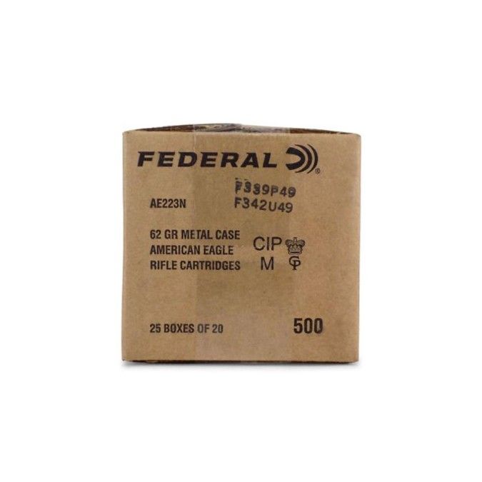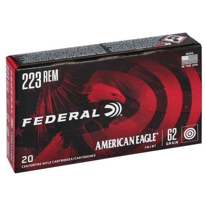 Federal American Eagle Rifle Ammunition .223 Rem 62 gr FMJ 3020 fps 500/c $230 CASH ONLY! BRAND: FEDERAL BRAND FAMILY: AMERICAN EAGLE BULLET TYPE: FMJBT CALIBER: 223 REM GRAIN: 62 GR ROUNDS: 500 VELOCITY: 3020 FPS