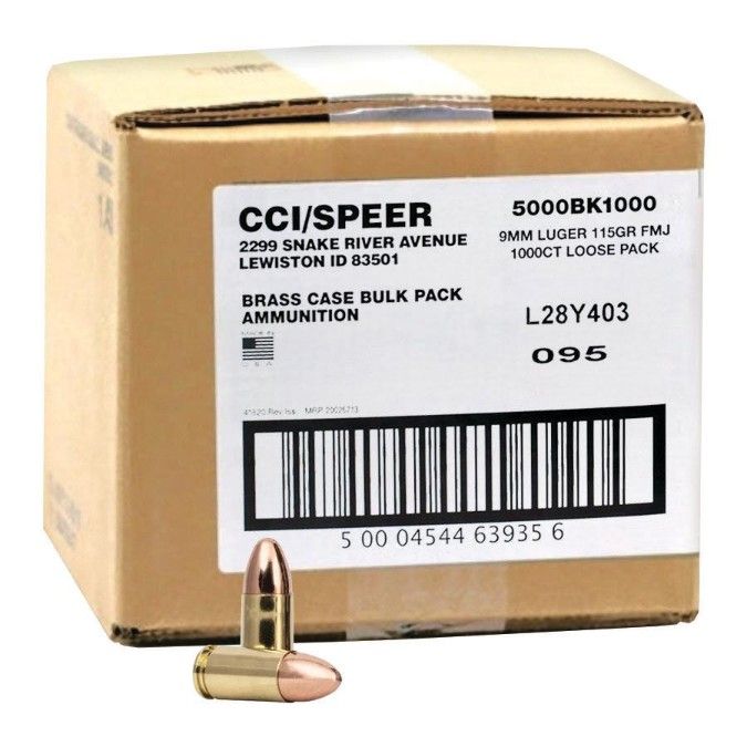 CCI Blazer Brass Handgun Ammunition 9mm Luger 115 gr FMJ 1145 fps 1000/ct Loose Pack $225 CASH ONLY SPECIFICATIONS BOXES PER CASE: 1 BRAND: CCI BRAND FAMILY: BLAZER BRASS BULLET TYPE: FMJ CA PROP 65: YES CALIBER: 9MM LUGER CASE MATERIAL: BRASS CASE PACK: LOOSE COMPLIANCE ITEM TYPE: HANDGUN AMMO ENERGY: 335 FT-LBS GRAIN: 115 GR LEAD FREE: NO PACKAGE/PACKING: BULK PRIMER: BOXER RELOADABLE CASE: YES ROUNDS: 1000 VELOCITY: 1145 FPS CCI Blazer Brass Handgun Ammunition offers an unbeatable combination of affordability and reliability, making it a favorite among frequent shooters and gun enthusiasts alike. This loose pack contains 1000 rounds of high-quality Full Metal Jacket (FMJ) bullets designed to deliver consistent accuracy during target practice or training sessions. Each round features a durable brass casing that ensures smooth feeding and ejection in semi-auto handguns while maintaining excellent accuracy shot after shot. With its clean-shooting design, Blazer Brass Handgun Ammo reduces residue build-up, minimizing maintenance needs and enhancing overall firearm longevity. The lightweight 115-grain FMJ bullets are engineered to achieve a muzzle velocity of 1145 fps, providing optimal performance for both novice and experienced shooters during range practice or recreational use. This 1000 rounds loose-pack of CCI Blazer Brass Handgun Ammo not only offers significant savings but also ensures you have plenty of rounds on hand for extended shooting sessions without frequent reordering. Loose pack includes 1000 rounds. 115-grain Full Metal Jacket (FMJ) design. Muzzle velocity: 1145 fps. Brass casing: Durable and reliable. Clean-shooting: Reduces residue build-up. Ideal usage: Training & target practice. Affordable pricing: Perfect for bulk buyers. Upgrade your shooting experience today with the trusted performance of CCI Blazer Brass Handgun Ammunition!