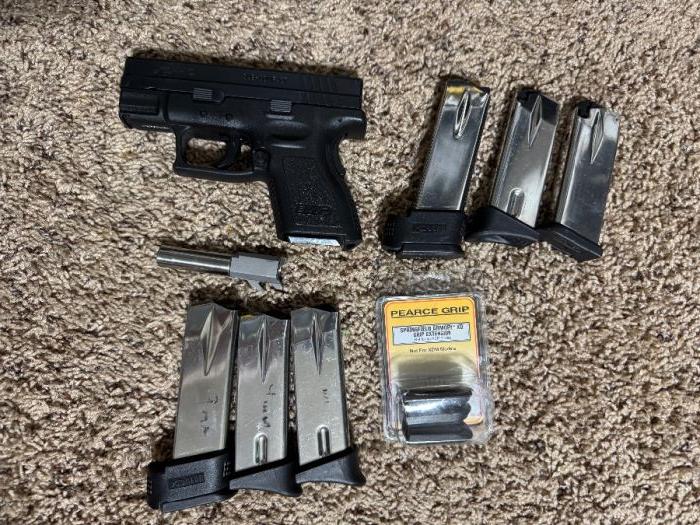 Here is a Springfield XD Subcompact in .40 S&W. I bought this after buying my full size XD since my mags and holster were compatible. I carried it for a little while but never really used it otherwise. Unknown round count but everything still in excellent condition. It includes a 9mm EFK Fire Dragon conversion barrel, pinky magazine extensions for the short mags, 6 magazines—3 in .40 and 3 9mm, and pistol range bag. Asking $600. Face to face only, no codes, no trades, and must be legally able to own a pistol. Texts preferred.