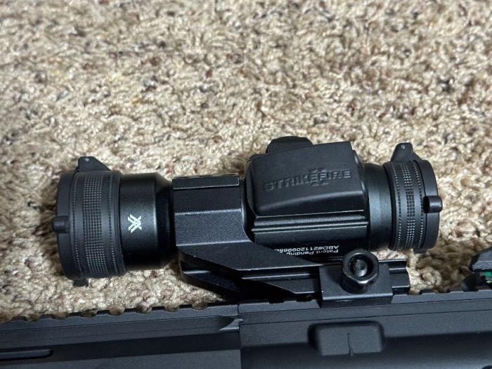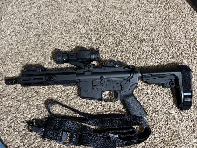 Here is a PSA 300 Blackout 8” barreled pistol. I started this build with the intent to suppress it but at the last minute decided to pick up a PSA JAKL instead. This has never been fired—all new parts. Upgraded parts included VG6 muzzle device, Superlative Arms adjustable gas block, PSA drop in trigger group, Timber Creek Enforcer Ambi Charging Handle, Vortex Strikefire II optic, unbranded flip up sights, and QD sling. The quality of the PSA trigger group actually surprised my gunsmith friend. Asking $800. Face to face only, no codes, no trades, and must be legally able to own this firearm. Texts preferred.