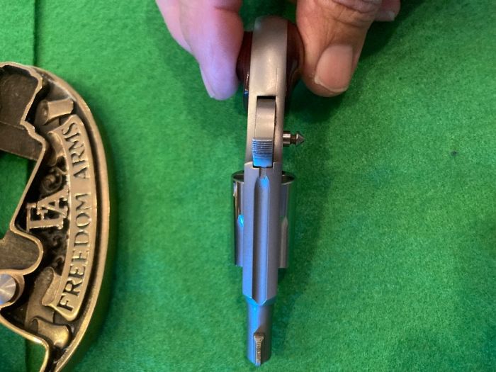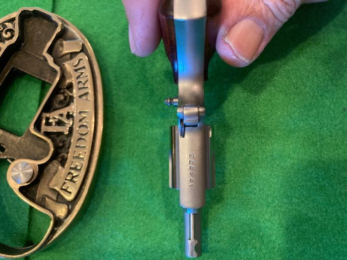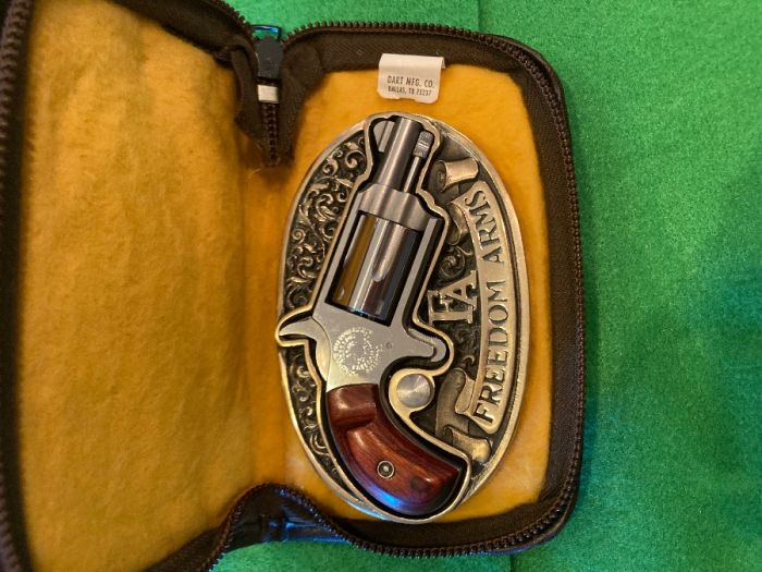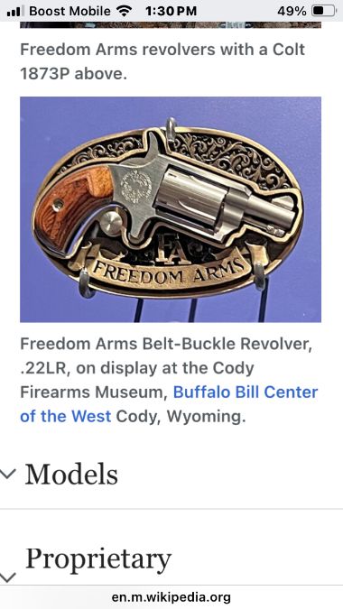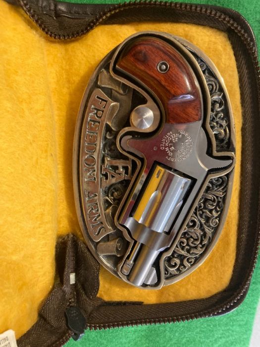.22 Long Rifle Belt Buckle called the “Patriot “ these were the first firearms made by Freedom Arms company. These are very sought after by collectors and there is an example of one in the Cody firearms museum as pictured. Firearm is in excellent condition as new! For sale or trade if interested text 530-415-6669