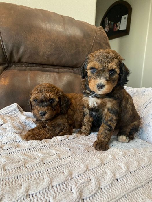 If you are looking for a new addition for your family, Mini Aussie doodles are a great choice! They are friendly, loving, loyal, intelligent, hypoallergenic and nonshedding. Sandy an f1b Aussie doodle is the mother of our puppies. She weighs 28 pounds and has been wonderful for our family. The father Max is a 13 pound miniature poodle. The puppies have been around children and other animals. We have done ENS with them. They will have a vet check, be up to date on shots and deworming. Dewclaws have been removed. Can go to their new homes October 20th. We could help with delivery of puppy. Call or text with any questions. 208-339-4257