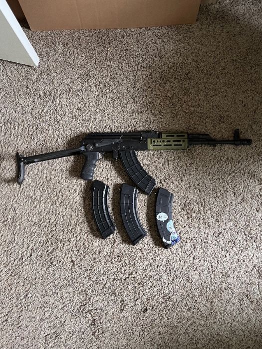 Custom underfold AK. Factory three-way switch. Custom grips. Muzzle flash adapter piece. 6-30rd mags. Put 500rds down the barrel. Shoots amazing $1200obo