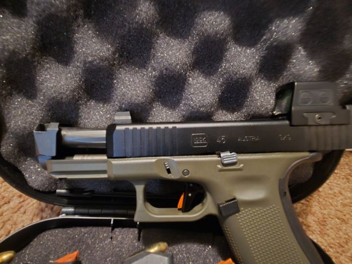 Glock 45 with radian afterburner mini comp and ramjet barrel holsun red dot and timney 3lb trigger 4 mags 3 w/ extensions asking 1000 call or text 2o8989o152