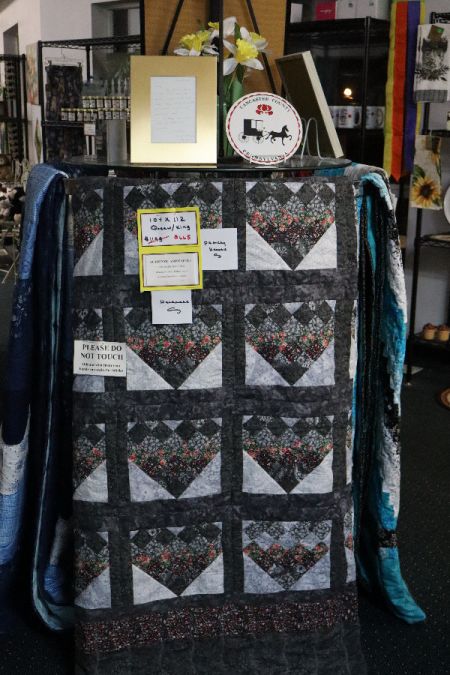 AUTHENTIC HANDMADE AMISH QUILT FROM PENNSYLVANIA BY EVA FISHER. QUILT MEASURES 104X112. COLORS ARE CREAM, BLACK, GRAY AND ROSE. PROCEEDS GO TO ST. JUDE CHILDREN'S HOSPITAL. PONDEROSA SPORTS, 6854 HIGHWAY 55, HORSESHOE BEND, IDAHO 83629. 208-793-3121. OPEN 10-6 DAILY. CLOSED ON TUESDAY. STOP BY AND SEE OUR LARGE SELECTION IN STOCK. WONDERFUL CHRISTMAS PRESENT FOR SOMEONE SPECIAL.