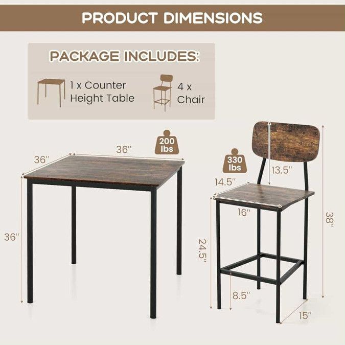 We did not end up needing this, it has never been opened, new, still in box. Giantex 5-Piece Dining Table Set W/Counter Height Table & 4 Bar Stools, Industrial Kitchen Dining Set W/Footrest & Backrest.