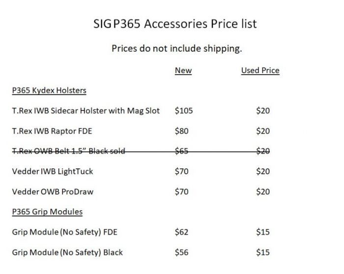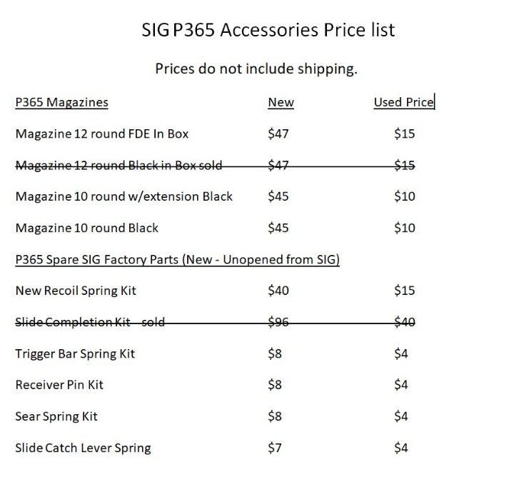 Selling SIG P365 NEW Accessories & Parts at very discounted prices. Moving to a new business. See the attached Price Lists. Additional charges for shipping. Will consider offers/package deals.