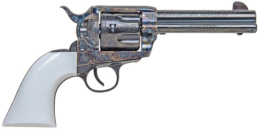 Traditions 1873 Frontier Series Engraved, Model SAT73110BTM, 45 Colt (LC), 6rd 4.75" Blued Barrel & Cylinder Color Case Hardened Steel Frame White PVC Grip.