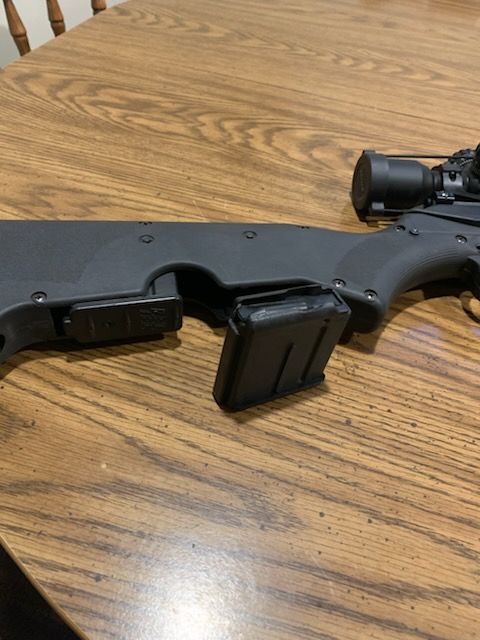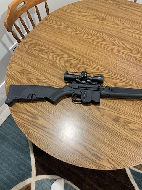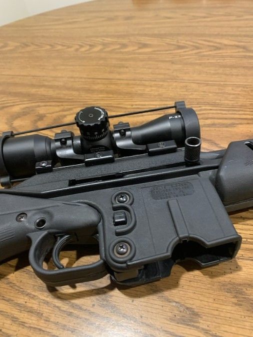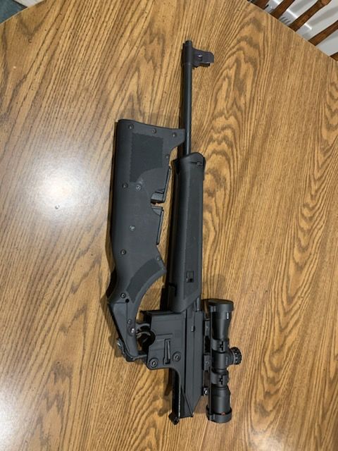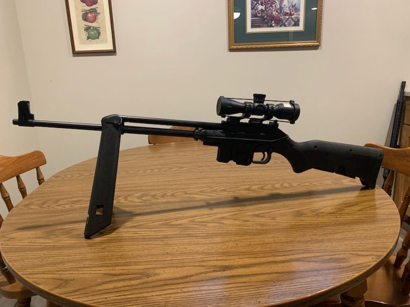 Very little use and in XLNT condition. Hold 2 mag. in the stock and will take AR mag. Pull a pin and it fold to 22". Comes with a Nikon P-223 scope and 2 magazines. side lever charging. Light weight and fun to shoot.