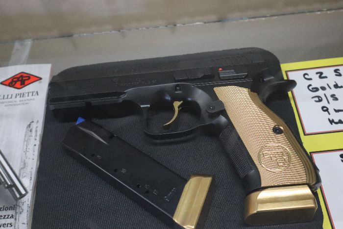 CZ SHADOW 2, GOLD DIGGER, TALO EXCLUSIVE, DOUBLE ACTION/SINGLE ACTION, SEMI AUTO,METAL FRAME PISTOL, 9MM, MATTE FINISH, BLACK, ALUMINUM GRIPS, MANUAL SAFETY, OPTIC CUT SLIDE, FIBER OPTIC FRONT SIGHT/HAJO ADJUSTABLE REAR SIGHT, 2-19 ROUND MAGAZINES, BRASS GRIPS, BRASS TRIGGER, BRASS MAG BASES, SPECIAL EDITION ENGRAVED ON FRAME. 4.89"COLD HAMMER FORGED BARREL, JUST RECEIVED IN HARD CASE WITH AMMUNITION. (ABSOLUTELY BREATHTAKING GUN) $1399. PONDEROSA SPORTS, 6854 HIGHWAY 55, HORSESHOE BEND, IDAHO 83629. 208-793-3121. OPEN 10-6 DAILY. CLOSED ON TUESDAY.