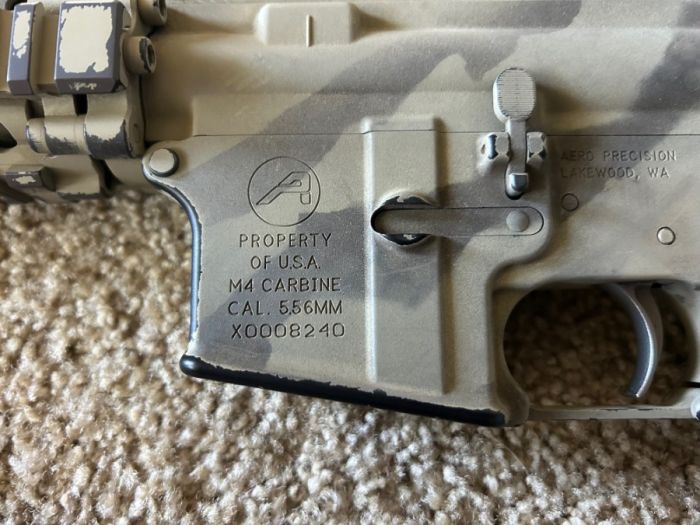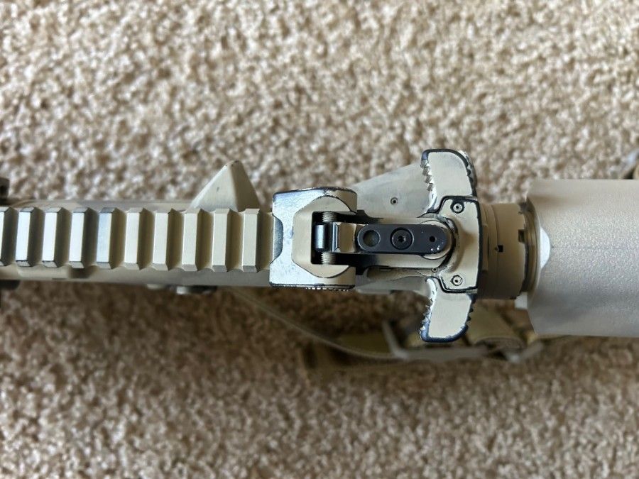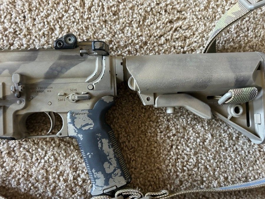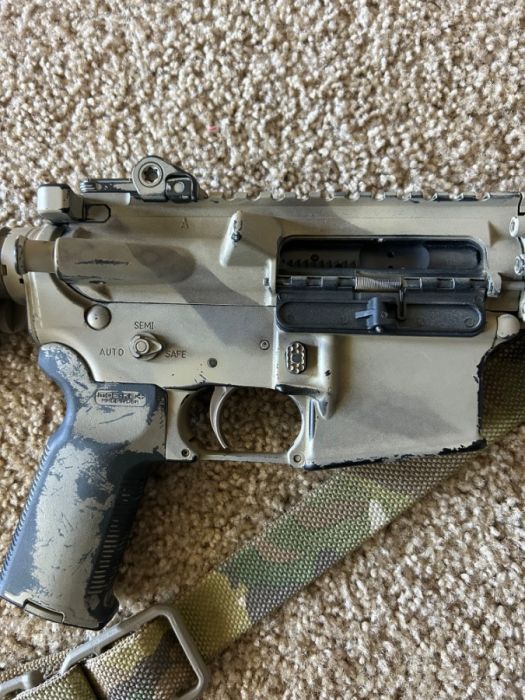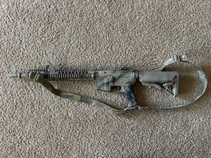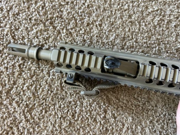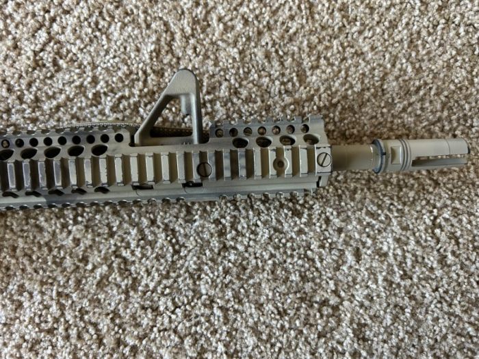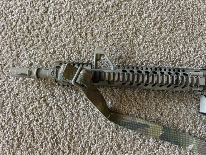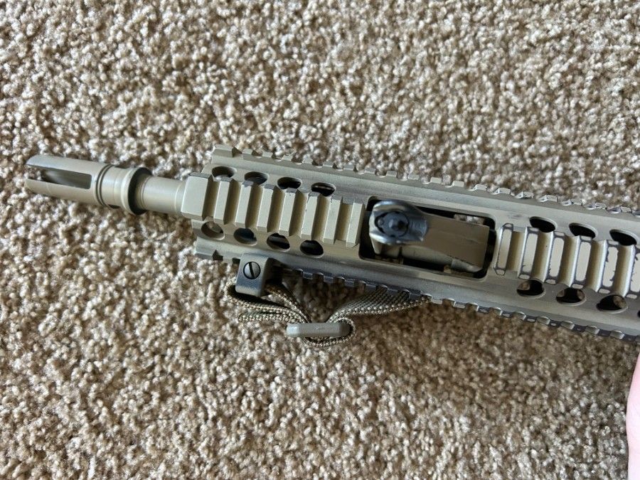 Daniel Defense upper with Aero Precision M4 lower, and a pinned and welded Surefire three prong flash hider. Under 800 round count on this rifle. Daniel Defense bolt carrier group, B5 SOPMOD enhanced stock in FDE, magpul K2+ grip, standard milspec trigger, and Scalarworks folding rear ironsight. Blue Force Gear Multicam Vickers Sling included.