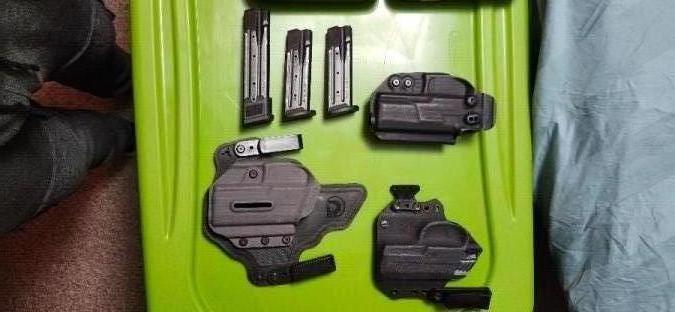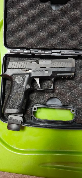 P320 X-Carry Had about a thousand rounds through it, never had any issues. Comes with two standard mags and one extended. 3 holsters included as well, IWB black arches, OWB black arches, Pitbull tactical IWB/OWB with kydex accessories. Just don't use it often and want something smaller instead.