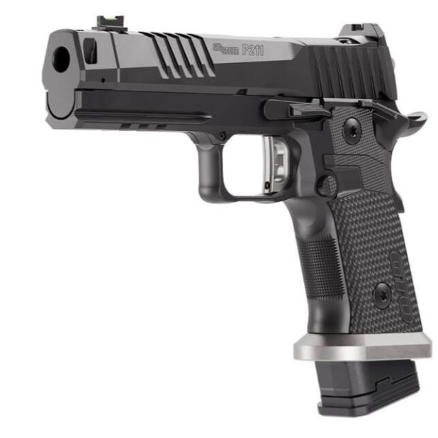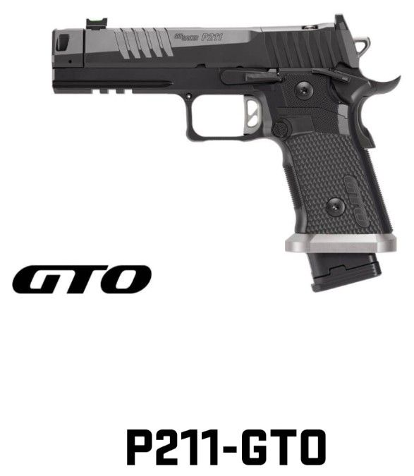 SIG SAUER P211-GTO gives the timeless features and performance driven design of double-stack 1911 pistols – a new modern twist. At its core, the P211-GTO is built for speed and precision. Its innovative compensator design uses some of the most advanced manufacturing techniques in the industry, capable of delivering unprecedented reductions in recoil, and the P211 has been engineered to use the reliable P320 magazine, made with unmatched precision and quality. “Engineered to deliver unmatched speed and flawless reliability,The P211-GTO combines groundbreaking innovation with the iconic, purpose-driven design at the heart of SIG SAUER’s legendary heritage.” The P211-GTO pairs a precision-crafted 4.4” bull barrel seamlessly with the new cutting-edge Mach3D compensator. This revolutionary, 3D-manufactured compensator uses a specialized gas flow design to dramatically reduce muzzle rise and felt recoil, allowing for faster, more accurate follow-up shots. A sleek, full-length dust cover adds essential balance and improves weight distribution while providing ample rail space for accessories. The pistol’s robust design ensures enhanced rigidity and a striking tactical aesthetic. The P211’s innovative straight-pull trigger provides a consistently smooth, clean pull—delivering comfort and pinpoint accuracy every time. The comprehensive safety features of the P211, include a grip safety, ambidextrous thumb safeties, and a reliable firing pin safety. 4.4” Bull Barrel paired with a precision-mounted Mach3D compensator Utilizes P320 magazines Steel frame with 3-slot accessory rail and full-length dust cover Compatible with picatinny rail mounted accessories Straight-pull trigger for a clean and consistent pull Precision-engineered alloy grip module Grip Safety, Ambidextrous Thumb Safeties and Firing Pin Safety mechanism Equipped with (1) 23rd and (2) 21rd P320-Compatible Steel Magazines MSRP $2599