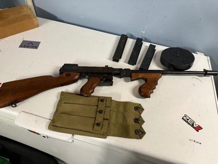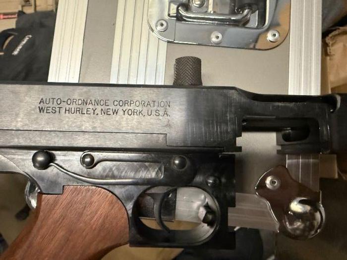 Auto-Ordnance Thompson Model of 1927A1 semiautomatic carbine in very good condition. Functions 100% — under 2k rounds through it. Includes one factory drum magazine and three stick magazines. Wood and finish are in good condition with normal handling marks — no major rust or pitting. Receiver marked “AUTO-ORDNANCE CORPORATION WEST HURLEY, NEW YORK U.S.A.” — civilian semiauto reproduction (non-transferable NFA).