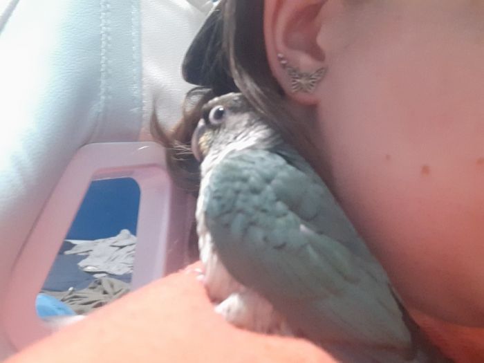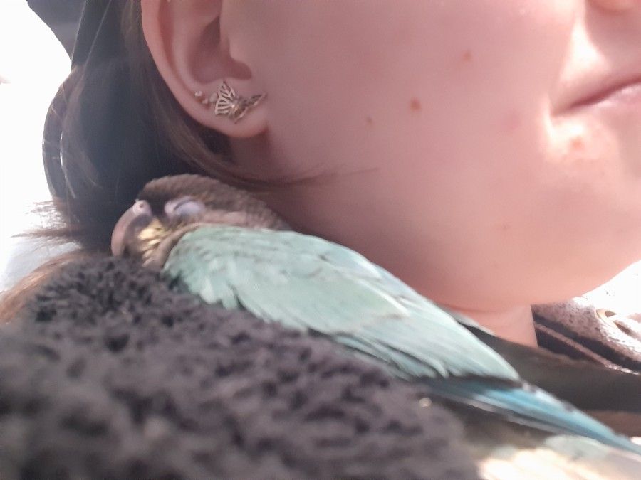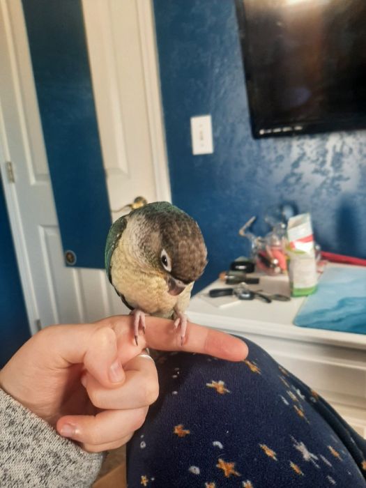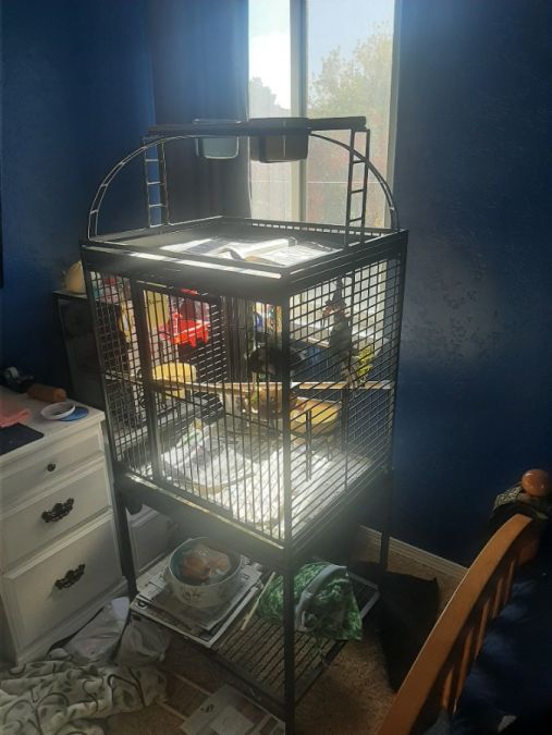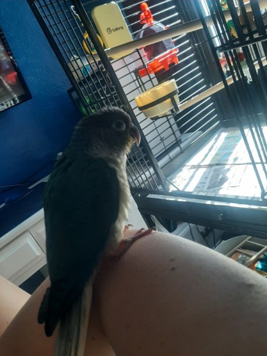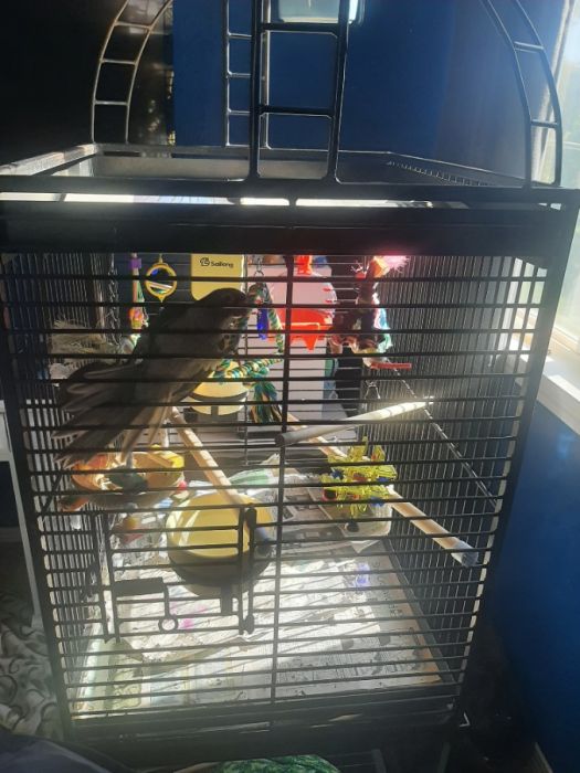 He's a beautiful and sweet bird and we bought him about 2 weeks ago for 500, but we since found out we're allergic to him so we can't keep him any longer. He's still young about 15 weeks and his wings are not clipped. He's good at flying and knows how to fly to your hand. I've taught him step up and he's begun to learn to use his cage as his bathroom. Everything that's included in price are: bird, cage, bird seed, toys, and treats. We would love for him to go to a nice home since we can't properly care for him with out allergies.