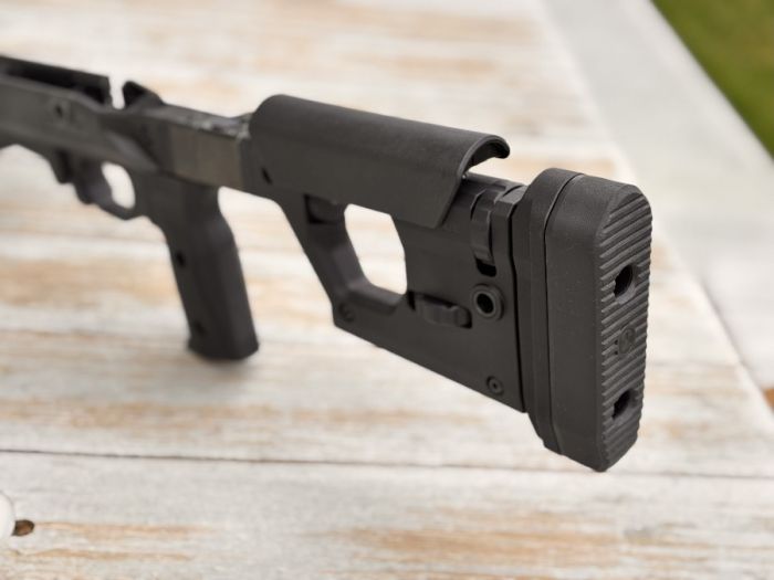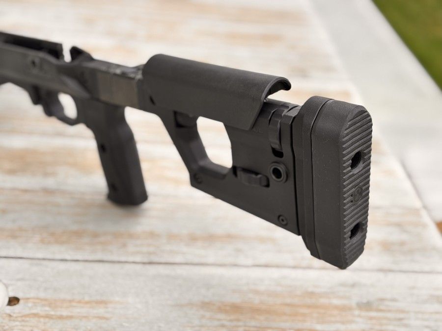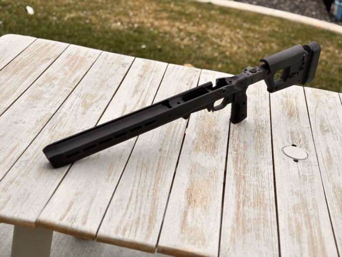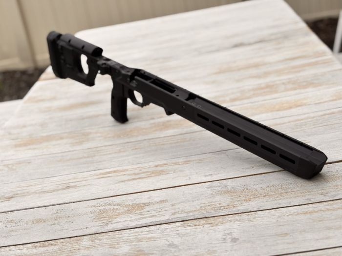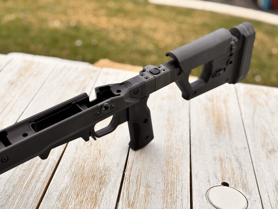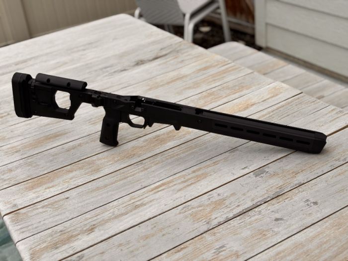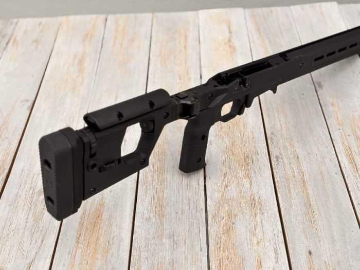 Never mounted but taken out of the package. One small scuff from the safe. Otherwise, in mint condition. Manufacturer: Magpul Industries Gun Make: Remington Gun Model: Remington Model 700 Short Action Finish: Anodized Hand: Ambidextrous Length: 34.6 in Weight: 5.4 lb Additional Features: M-LOK slots Condition: New Fabric/Material: Aluminium/Polymer Compatible with short action Remington 700 actions and other Remington 700 footprint actions. Type III hard anodized machined 6061-T6 billet aluminum V-bedding block, body, adjustment knobs and forend with high strength injection molded polymer body covers. Ambidextrous bedding block can be changed by swapping the QD sling swivel plate and bolt cut out plate for left or right hand actions using a 1/8in hex wrench. Folding stock with push-button activated durable steel hinge with Melonite finish is reversible for left or right folding capability with the use of a 5/32in hex wrench. A fixed stock adapter is available for a non-folding stock solution. Folding stock is also designed to avoid interference with the bolt handle when folded and is compatible with a large variety of aftermarket bolt knobs and handles. Optional inline mount for clip-on night vision and thermal imaging devices. Overall LOP adjustment range is 13.25in 15.125in. Butt pad height can be adjusted up 1.33in and down .90in and is adjustable left or right 5 degrees. Comb height adjustment has a 1-inch range with a secondary locking knob to eliminate movement in the cheek riser. Cheek riser features a 3-position fore/aft adjustment of +.375in, 0in and -.375in which can also be changed for left or right side usage. Injection molded polymer grip with 5 degree forward edge sweep and enlarged palm swell with 7 degree aft edge sweep, with a .75in fore/aft trigger reach adjustment. Additional grip option included with a more aggressive forward sweep (8 degree forward / 20 degree aft edge sweep). Durable steel rotation-limited QD sling swivel mounts with Melonite finish fits up to 1.5in push button swivels. M-LOK slots for accessory mounting on the forend (left-6/right-6/bottom-7) and the stock (bottom-2). Integrated AICS pattern magazine well optimized for PMAG 5 & PMAG 10 7.62 AC magazines as well as most other AICS pattern short action magazines. Large trigger guard allows for use with gloves and accepts most factory and aftermarket curved or flat triggers. Low-profile, anti-snag ambidextrous magazine release is made of Melonite treated steel for wear and corrosion resistance. Ambidextrous thumb shelf for firing hand thumb placement. Two 0.25 - 28x0.5in Socket Head Cap Screws are included for use as action screws. Height at Butt Plate 5.2in. Max width 1.86in. Length 32.7in to 34.6in (23.5in when folded).