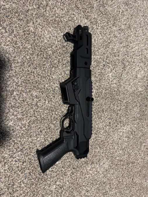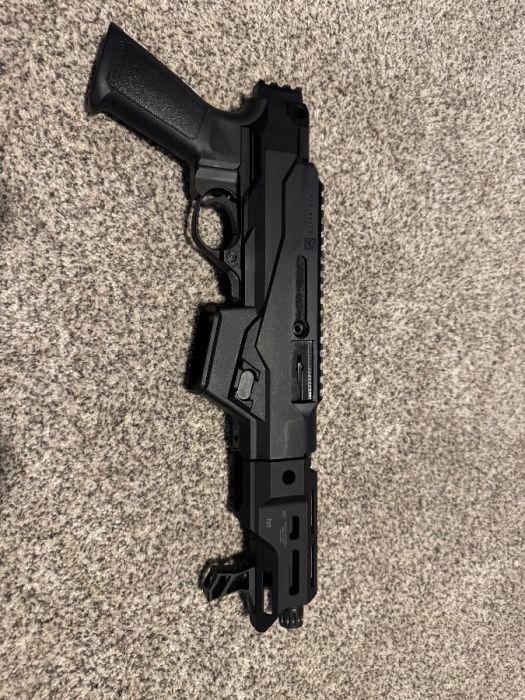 Ruger PC Charger 9mm PCC. Comes with aftermarket Midwest Industries handguard installed, has stock one as well. Compatible with Glock magazines. Capable of swapping out to the Smith and Wesson magazine compatible part included. Comes with 4 Glock PMAGs.