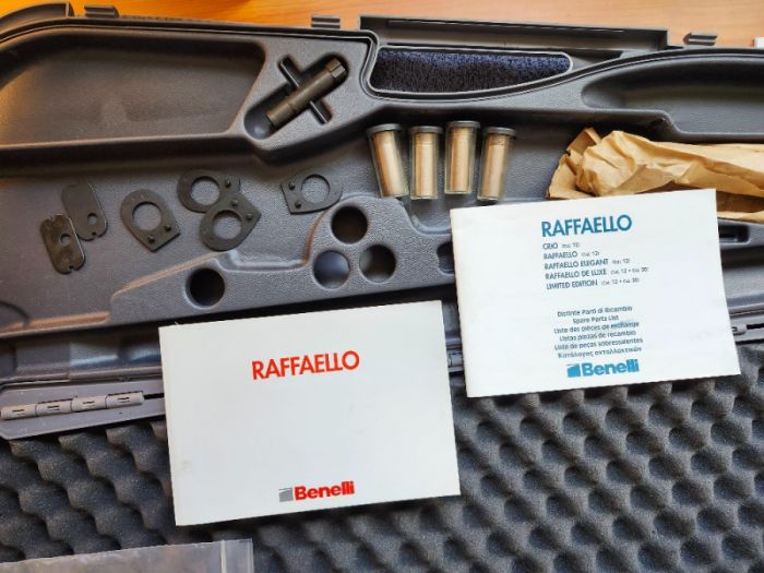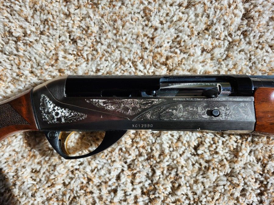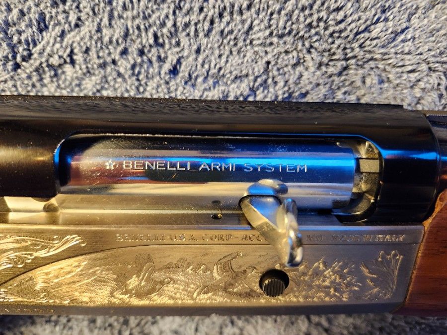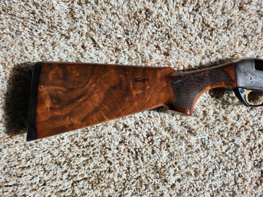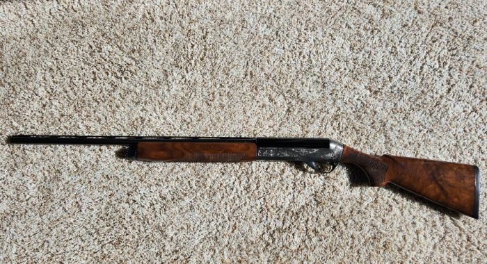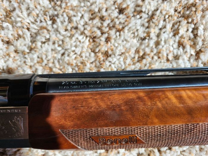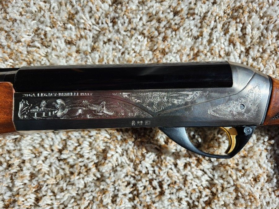 Benelli Legacy semi-automatic shotgun in 20ga accepting up to 3" shells. This Legacy is in excellent condition except for stock scratches on one side of the stock (chukar hunting fall) and includes (5) chokes (F-IM-M-IC-CL), manual, spare shims, choke wrench, owner's manuals and the original case. Manufactured in 2005 (BZ stamp). Very light gun, great for chasing birds in steep country. This shotgun has a 26" barrel, vent rib, and amazing engraving. Fiber-optic red-bead front sight and metal-bead mid sight. Gun works fine. Selling because I no longer have hunting dogs and I am not finding the time to go bird hunting. Replacement stocks are available online but I never replaced it because it was a hunting gun. No trades, cash only.