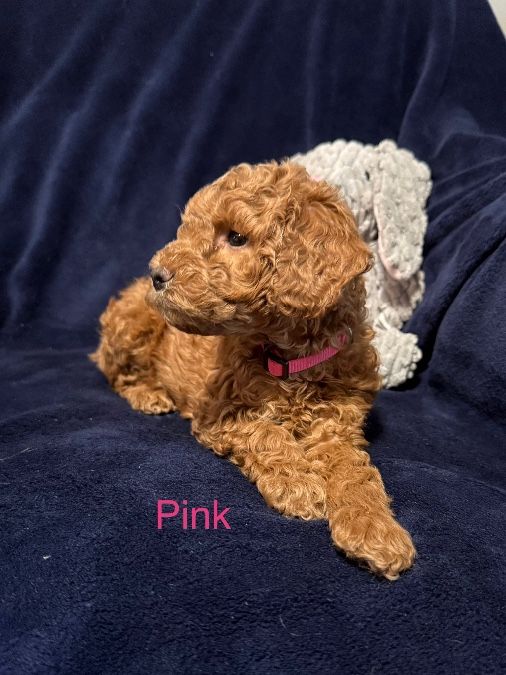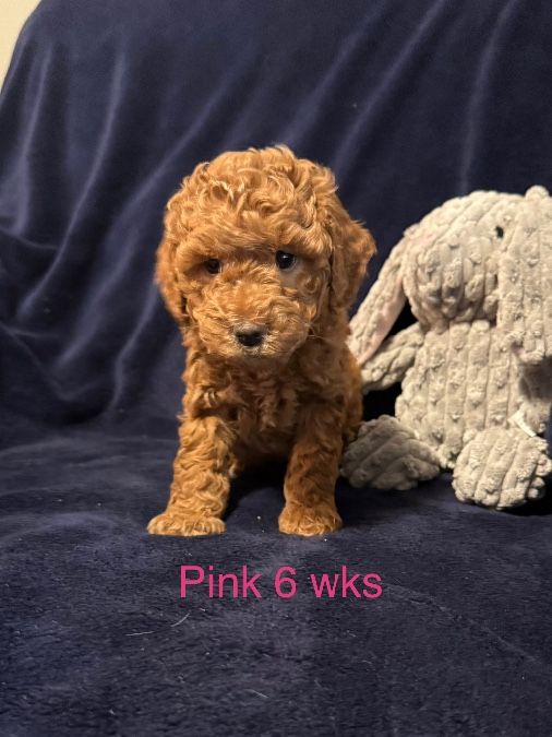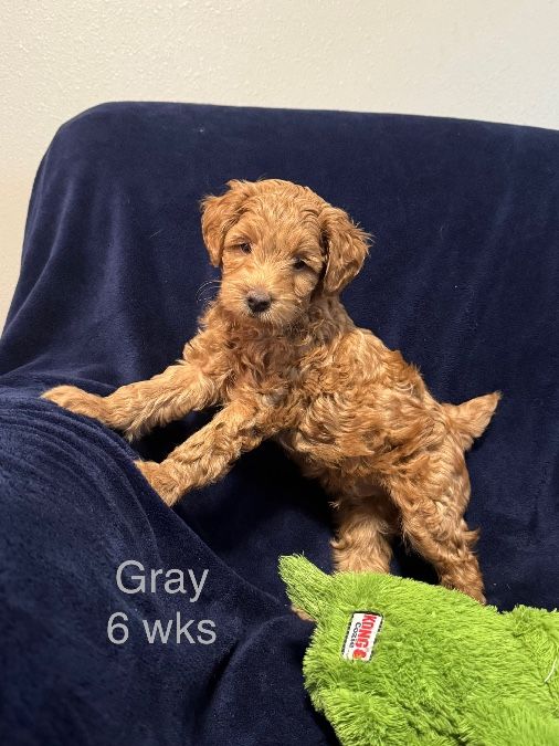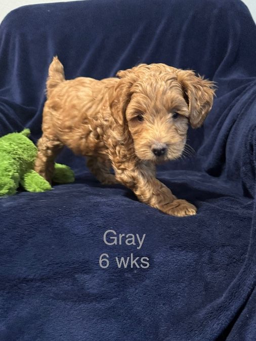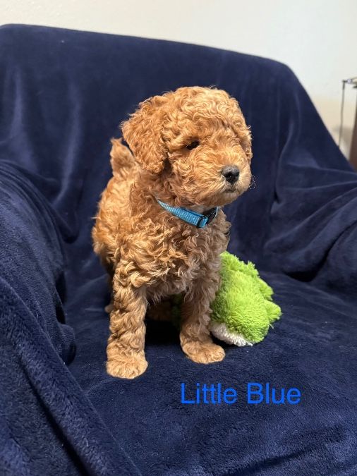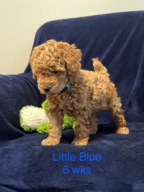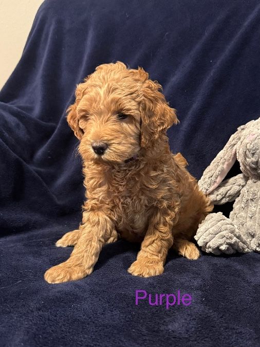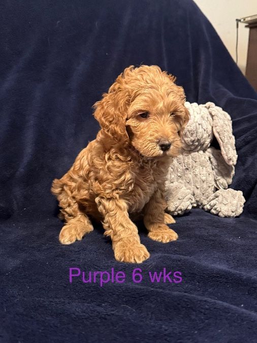 These darling labradoodle puppies are so sweet. Two smaller puppies with curly coats (pink and blue weighing 3lb 10oz at 6 weeks old) tracking to be 13-14lbs. Two wavy coat puppies (purple and gray weighing 4lb 5-8oz at 6 weeks) tracking to be 15.5-17lbs. Pink collar female is the darkest red of the puppies still available. Blue has the most handsome compact build. Gray and Purple have great little faces and long eyelashes. Mom is and apricot F1b ladradoodle 15inches tall and 25lbs at 3 years old. Dad is genetically clear, 10/10 red intensity, 14 inches tall and 13-14lbs. Embark testing is processing on these puppies. Mom has pretty much weaned them and they are doing great with puppy chow and using potty pads/ trays. Born September 13th, dewclaws removed and tails docked by vet. Vet exam and shots scheduled for October 30th. Ready to go home starting the weekend of November 7-9th. They will head home with a quart size bag of food, waterproof blanket, shot record, training treats, chew bone, and variety of toys. Females - Pink and Purple collar- $1,800 Males - Blue and Gray collar - $1,500 Asking a $250, non-refundable, deposit to hold your puppy. Deposit goes towards total price. Please text first, after that I am happy to call or FaceTime once I know it’s not a spam call.