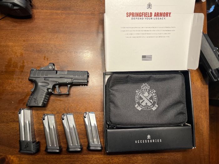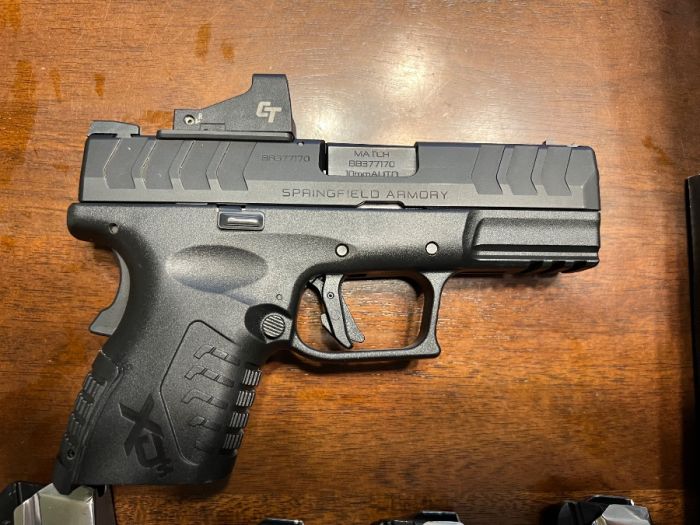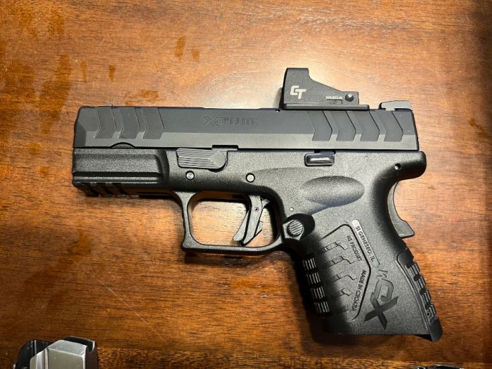 Selling a like-new Springfield XD-M Elite 10mm (3.8” barrel) - extremely low round count, stored clean, and upgraded with a Crimson Trace CTS-1550 red dot (2.5 MOA, auto-brightness). This is the compact, optics-ready model that hits way above its size class. Package includes: • XD-M Elite 10mm, 3.8” barrel • Crimson Trace CTS-1550 red dot (mounted, clean glass, auto-on) • (2) 11-round factory magazines • (1) 15-round factory magazine with extended grip sleeve • Original box and paperwork • Soft case included No issues, no damage, no surprises.