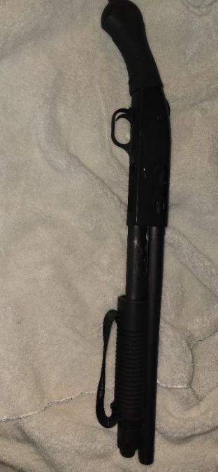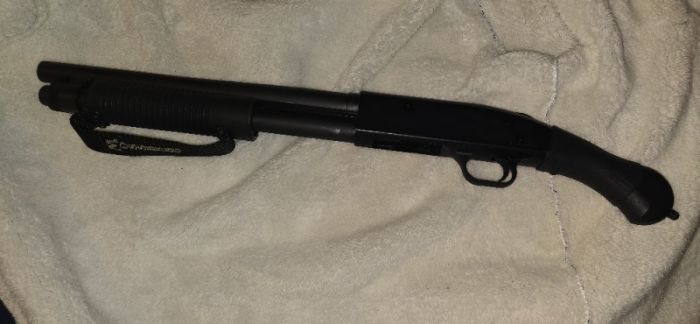 The Mossberg 590 Shockwave is a solid self-defense gun. It's got some key features like an ambidextrous safety, dual extractors, and a strong lockup. The pump action is smooth thanks to the twin action bars and anti-jam elevator. Plus, it's got a heavy-duty 14-inch barrel, a comfy grip. Pretty straightforward setup. Missing the front bead sight as well as having a few scuffs.
