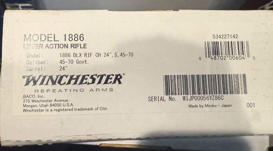 Winchester 1886 - .45-70 - Deluxe, Case Hardened, in original box. Excellent condition - less than 20 rounds fired. Thank you for the interest, but I am not looking for a trade - trying to downsize!
