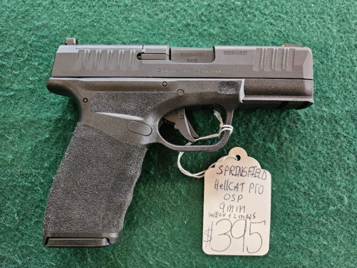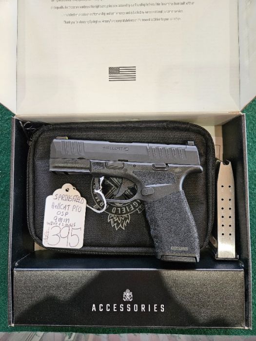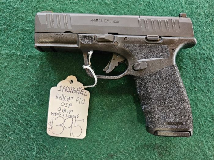 LIKE NEW CONDITION SPRINGFIELD HELLCAT PRO OSP 9MM WITH FACTORY BOX, CARRY CASE, 2 MAGS.. CALL 208 365 9881 OR COME GET IT AT KINGFISHER SPORTING GOODS & PAWN EMMETT IDAHO... WE ALSO DO LAYAWAY.. 3%CHARGE FOR CARD PURCHASE.. CASH IS KING