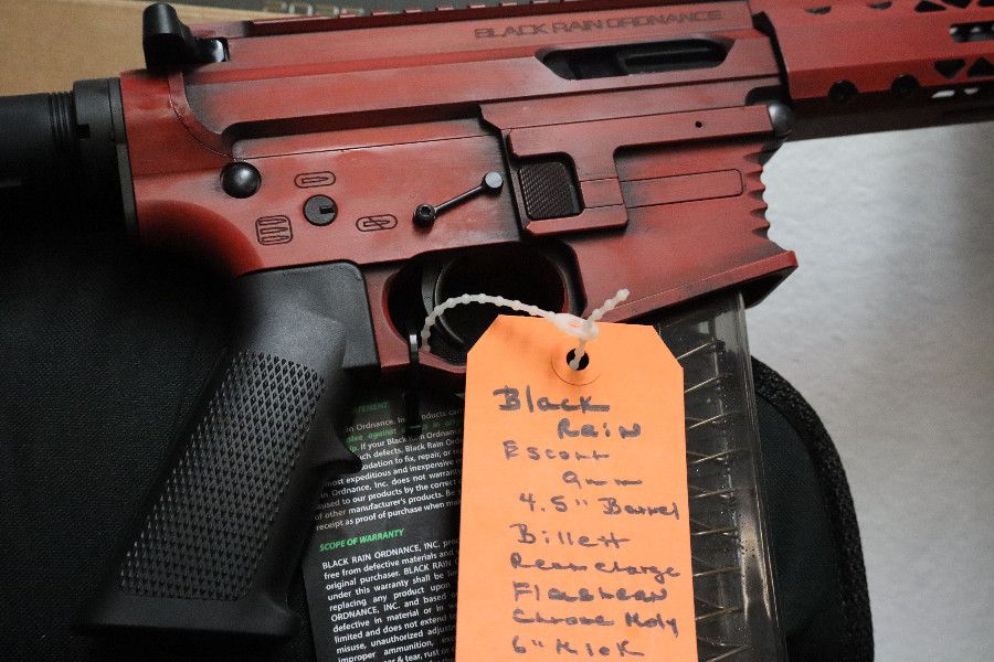 BLACK RAIN ESCORT, 9MM AR PISTOL, PCW REAR CHARGING. 4.5"CHROME MOLY BARREL, BILLET FALLOUT RECEIVER, MLOK HAND GUARD, USES GLOCK STYLE MAGS, LIGHTWEIGHT, SBA 3 BRACE, FLASH CAN MUZZLE BRAKE, SALT NITRIDE BCG, RED BATTLEWORN FINISH, COMES WITH 100 ROUNDS OF AMMO, BLACK RAIN CARRY CASE, 2 MAGAZINES. $1299. PONDEROSA SPORTS, 6854 HIGHWAY 55, HORSESHOE BEND, IDAHO 83629. 208-793-3121. OPEN 10-6 DAILY. CLOSED ON TUESDAY. LAYAWAY AVAILABLE.